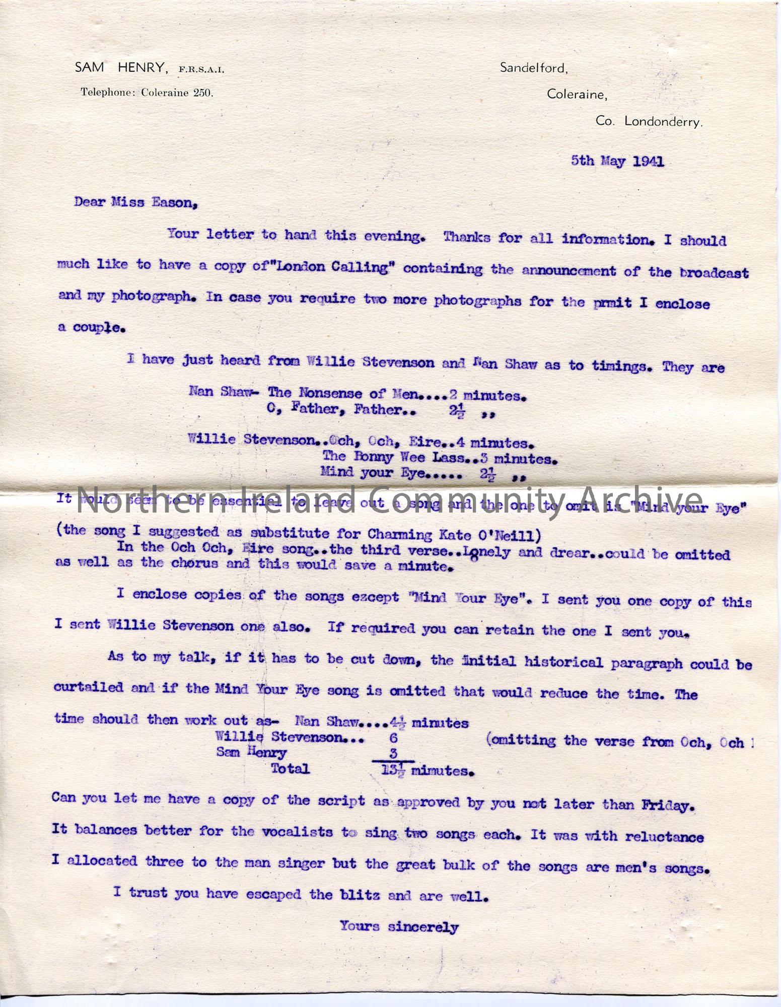 Typed letter relating to May 10th programme recording – songs/ singers/ script approval.