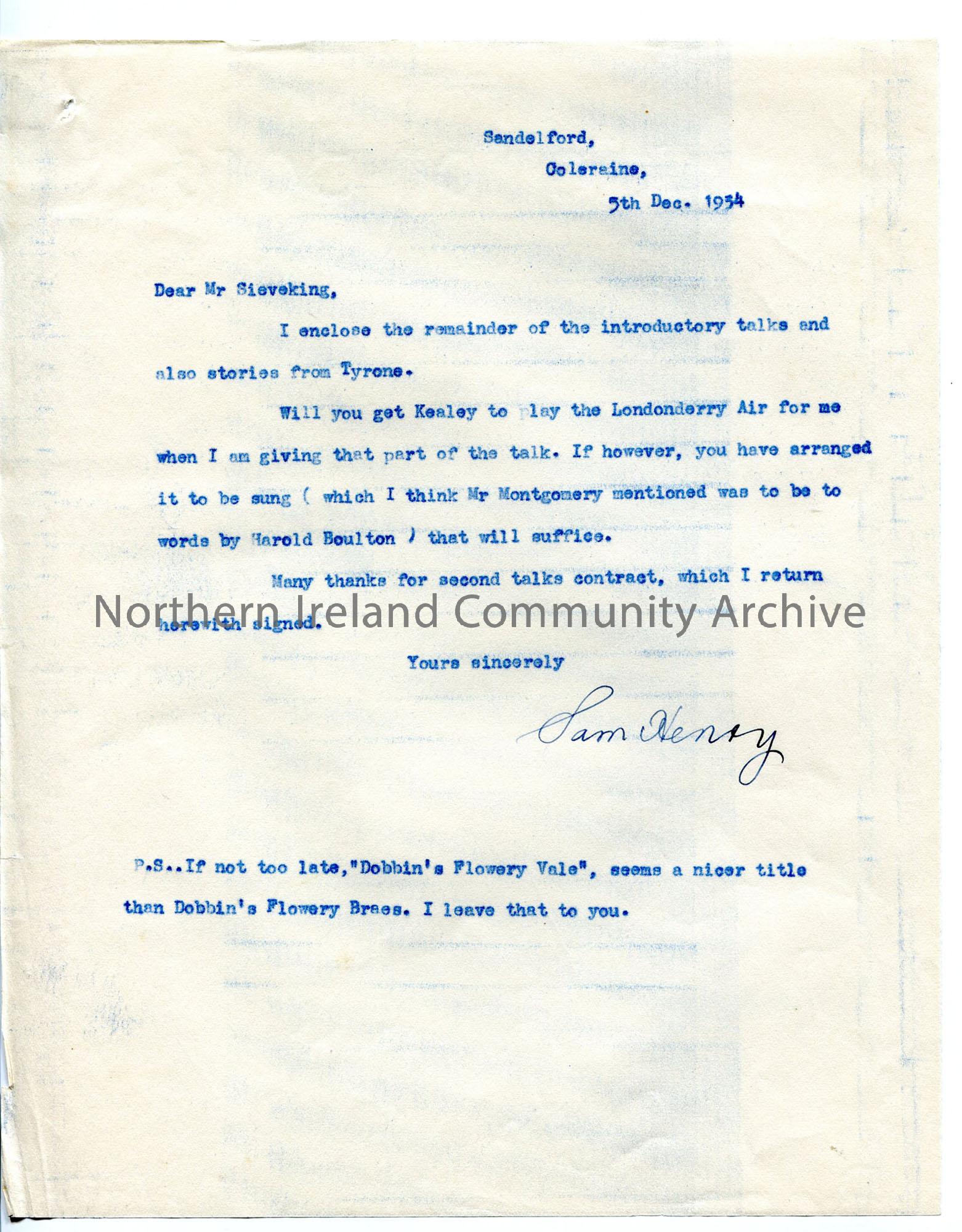 Typed letter relating to stories from Tyrone and other scripts and arrangements fro broadcast (‘Christmas Tree’ programme)