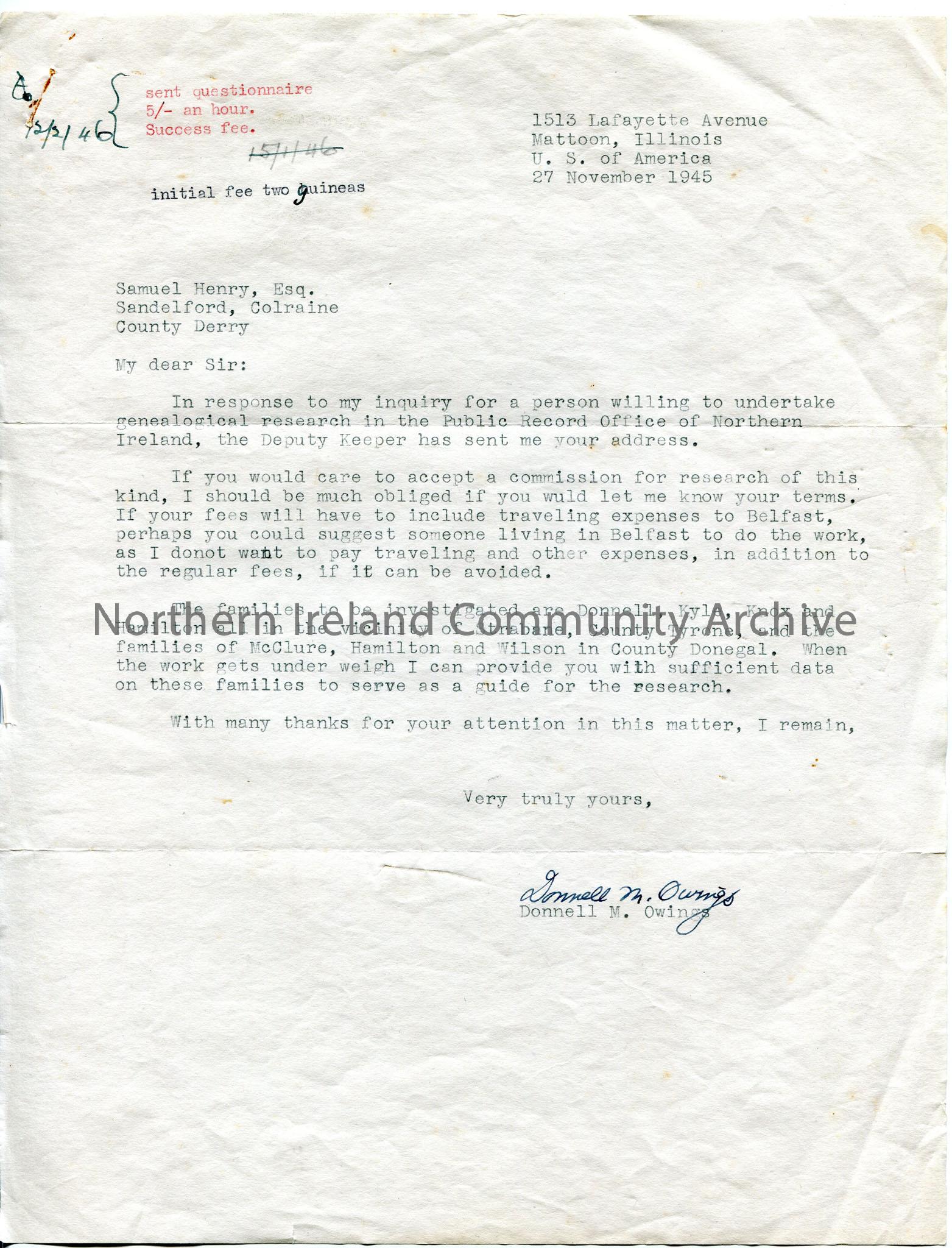 Typed letter requesting research help for Donnells, Kyles, Knoxes and Hamiltons of Tyrone and McClures, Hamiltons and Wilsons of Donegal. Discusses fees