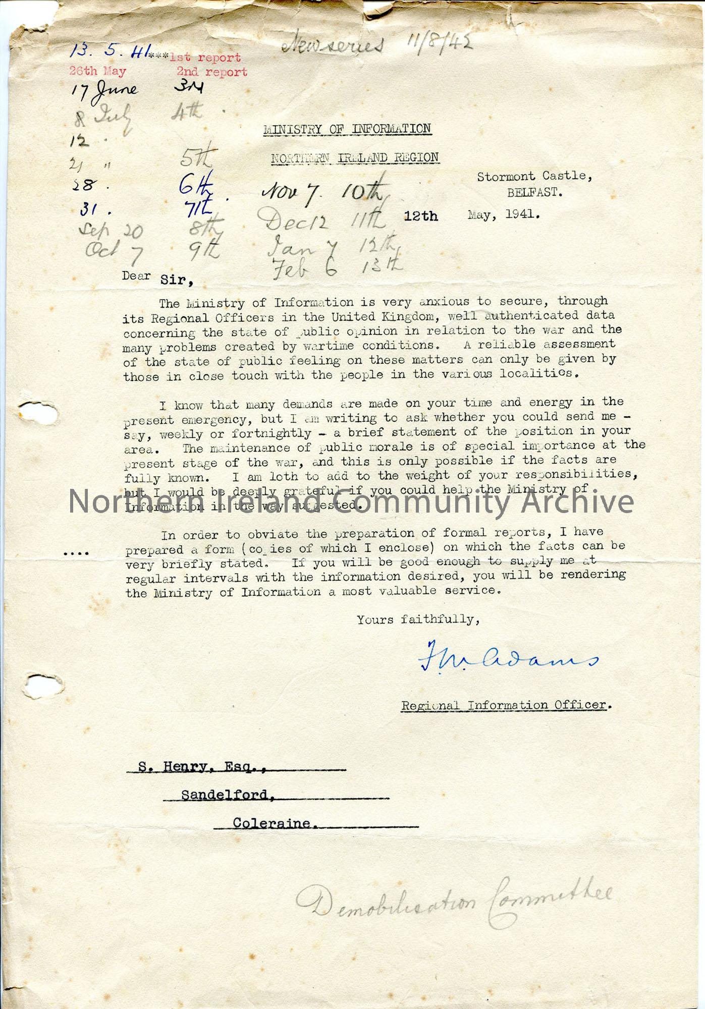 Typed letter – Sam invited by Ministry of Information to report on opinions about war and problems created by wartime conditions weekly or fortnightly…