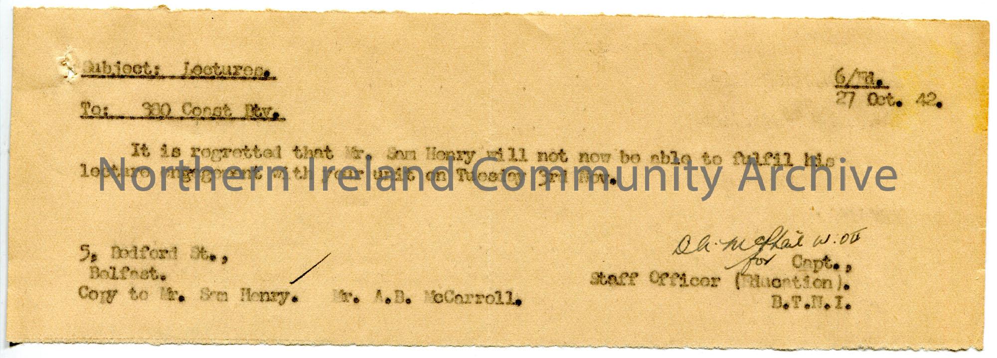 Typed letter to 380 Const Bty [Battery]. Writing that Sam Henry cannot attend a lecture to the unit on 3rd November 1942.