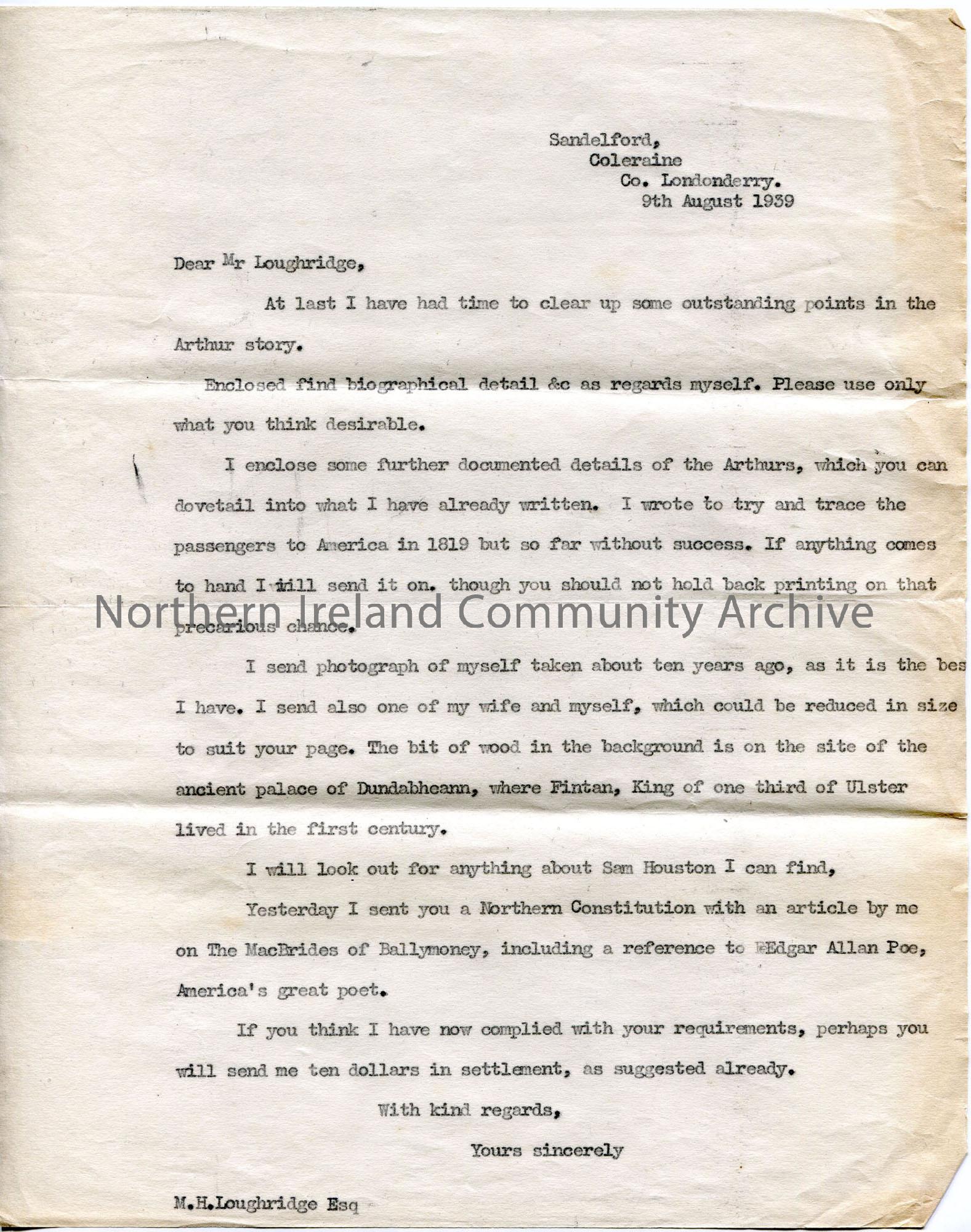 Typed letter to Loughridge from Sam Henry. Sending outstanding points for Arthur story plus biographical information and photos. Also included article…