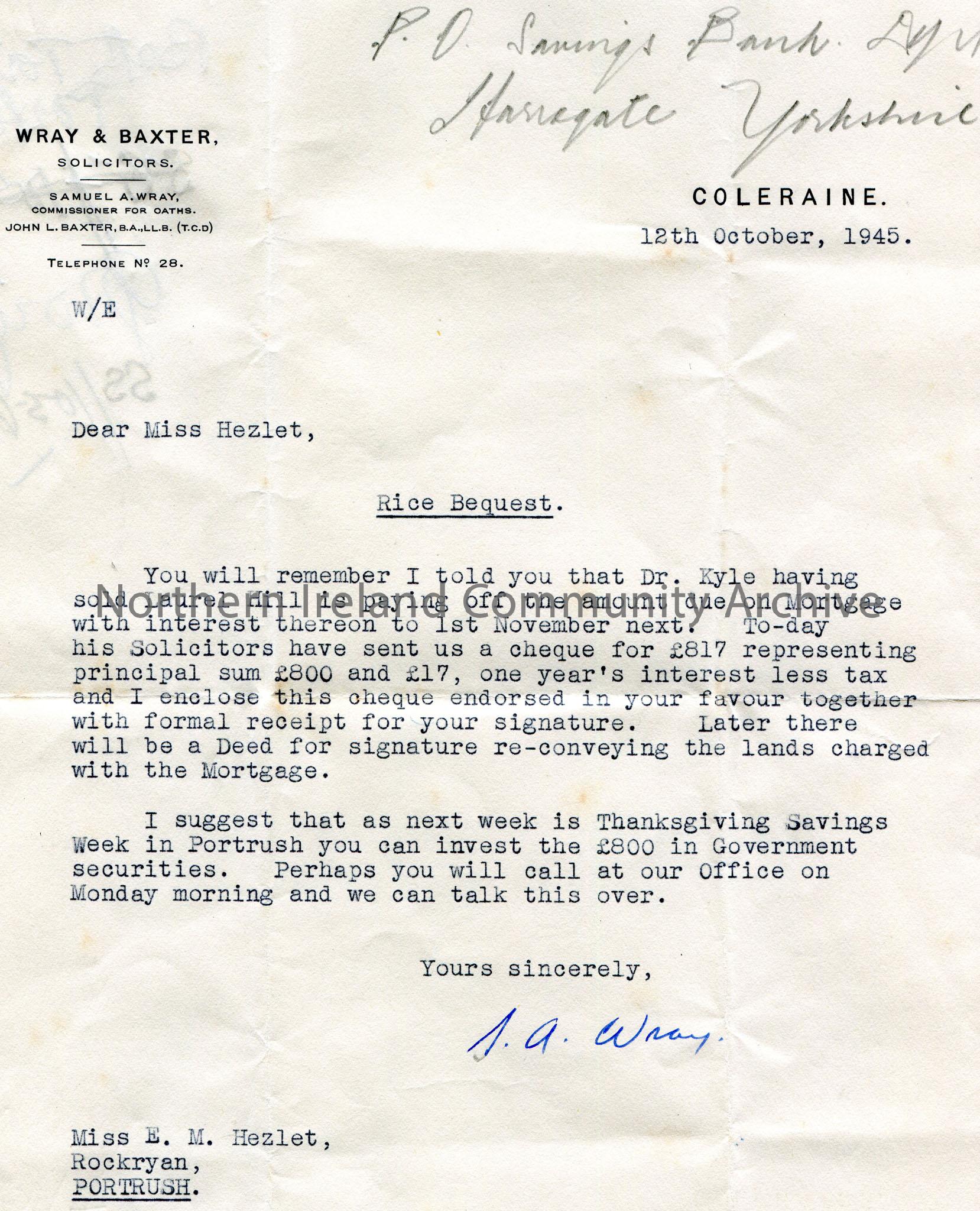Typed letter to Miss E. M. Hezlet at Rockryan, Portrush. Re Rice Bequest. Dr.Kyle has sold Laurel Hill and will pay of amount due on mortgage. Encloses a cheque for £800 and a Deed to sign for re-conveyance of the lands charged with the mortgage. Next weeks is Thanksgiving Savings Week in Portrush. Suggests Miss Hezlet invests the money in Government securities and to call into the office to talk it over. 'Bath Terrace, Portrush' and other rough notes written on back of letter.