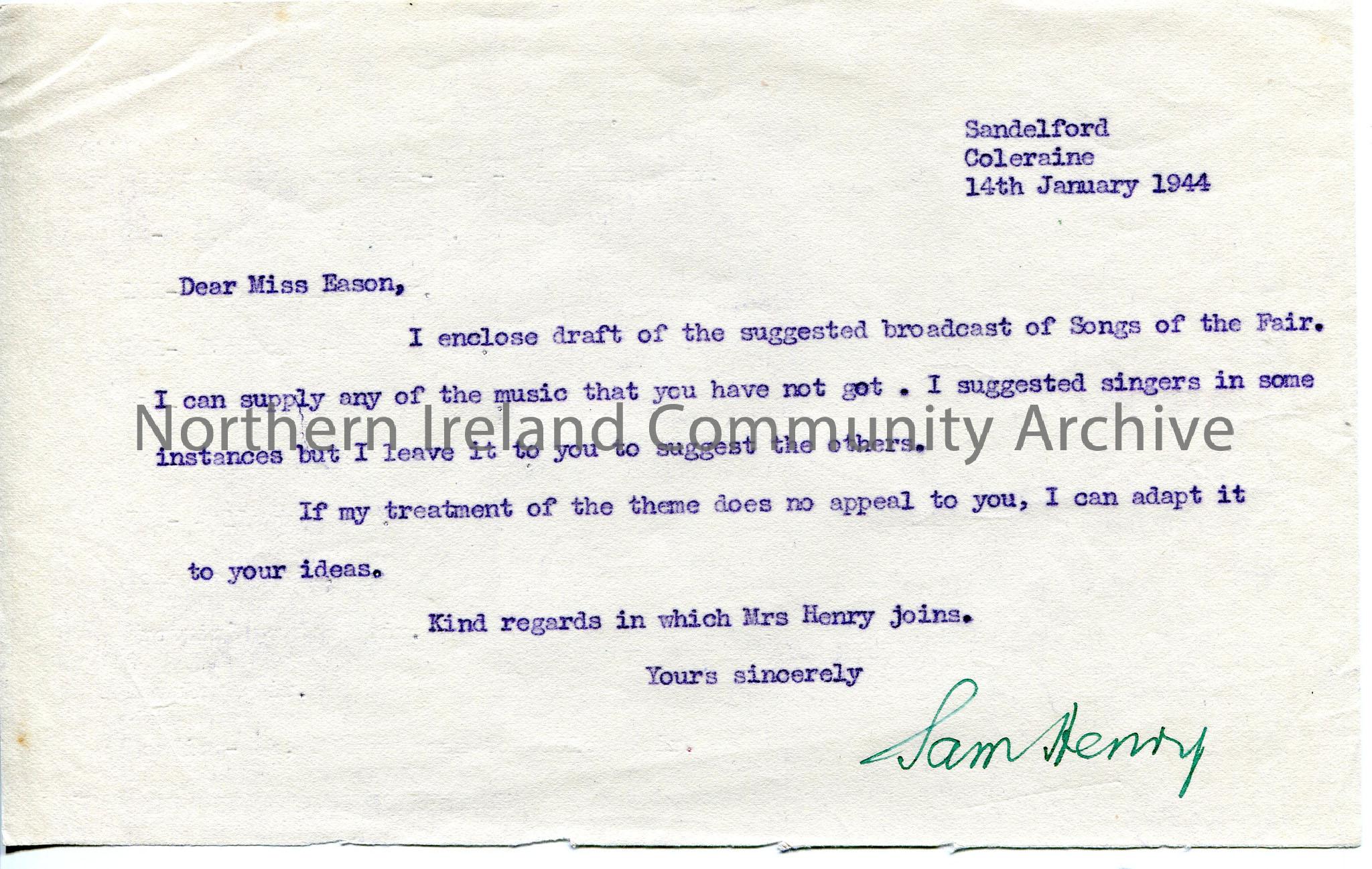 Typed letter to Miss Eason (Ursula Eason – Sam’s contact at BBC in Belfast) stating draft enclosed of script for ‘Songs of the Fair’ broadcast.