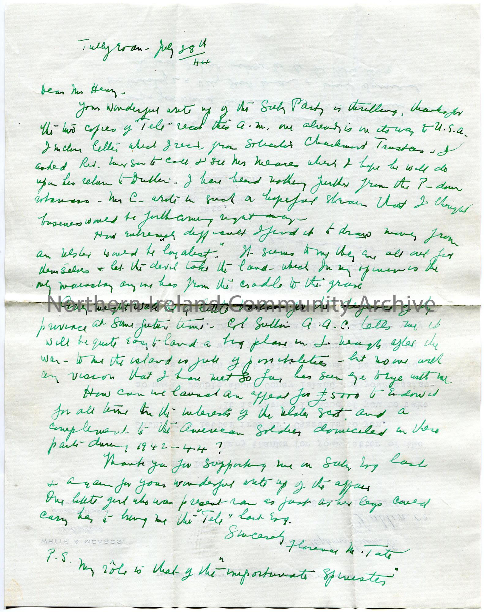 Typed letter to Miss Florence M Tate from White and Meares Solicitors. She appears to have forwarded this to Sam and handwritten her own letter on the reverse in green ink. Writing re Coney Island. Sam appears to have done a write up in the 'Tele' of the 'S? Party'.