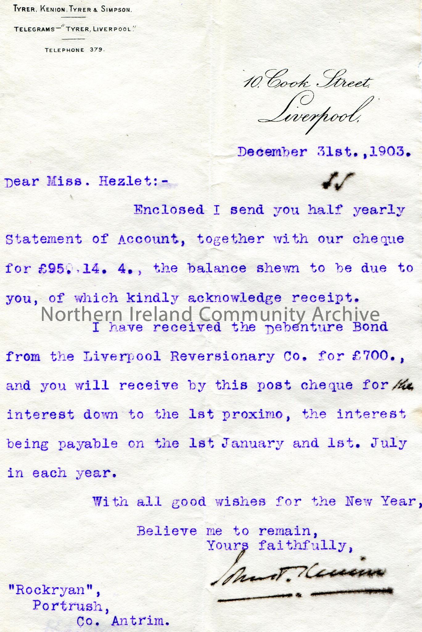 Typed letter to Miss Hezlet at Rockryan, Portrush, Co.Antrim. Enclosed a half yearly Statement of Account and a cheque for £95.14.4. He has received the Debenture Bond from the Liverpool Reversionary Company for £700 which will be send to Miss Hezlet by cheque.