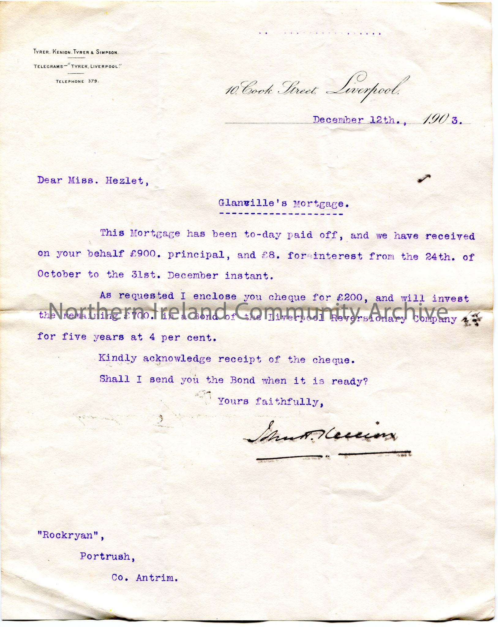 Typed letter to Miss Hezlet at Rockryan, Portrush, Co.Antrim re Glanville's mortgage. Writing to say the mortgage has been paid off. Encloses a cheque for £200 and the remaining £700 will be invested in a Bond of the Liverpool Reversionary Company.