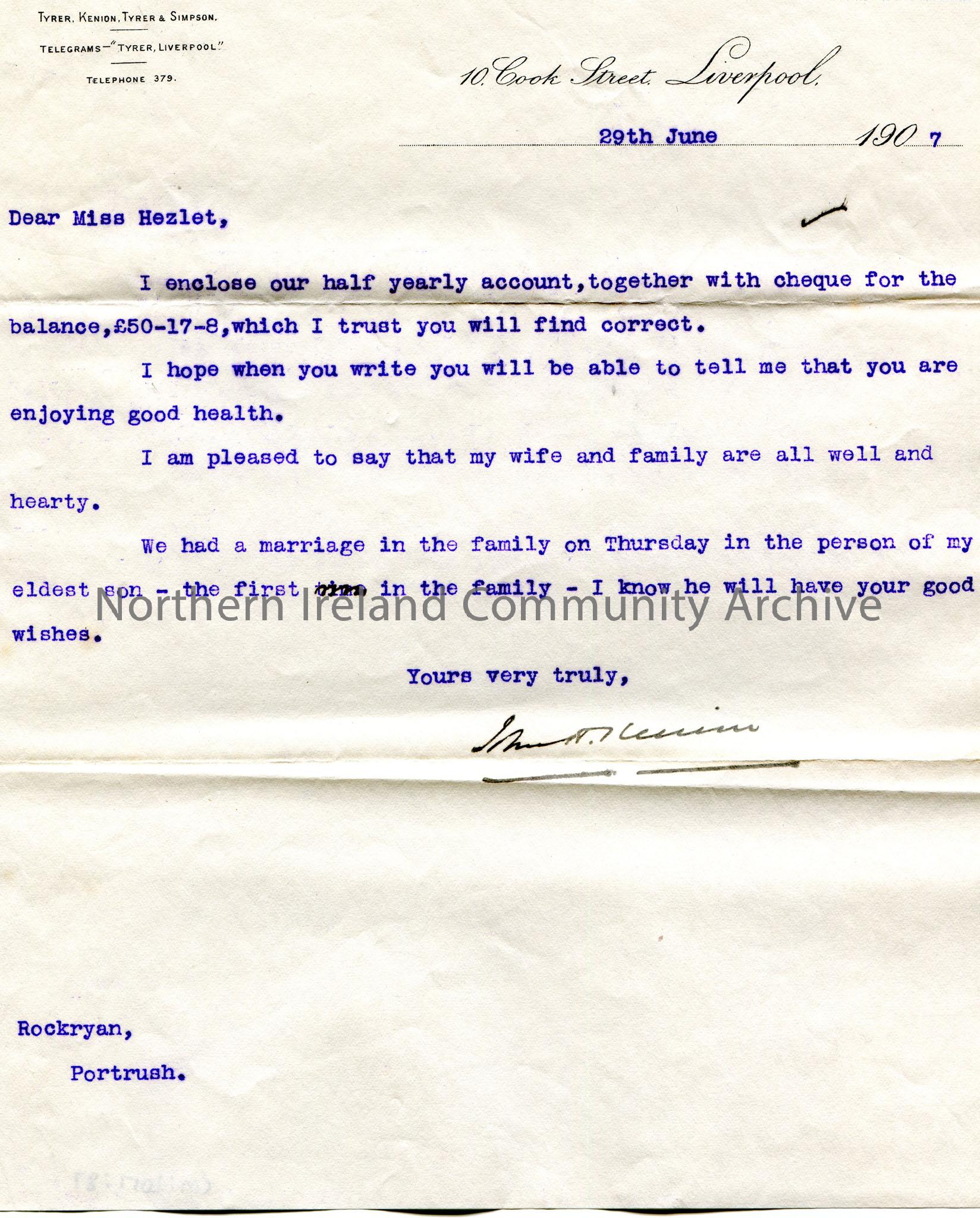 Typed letter to Miss Hezlet at Rockryan, Portrush. Encloses half yearly account statement and a cheque for £50.17.8. Asks about her health. Advises that his family is all well and his eldest son was recently married.