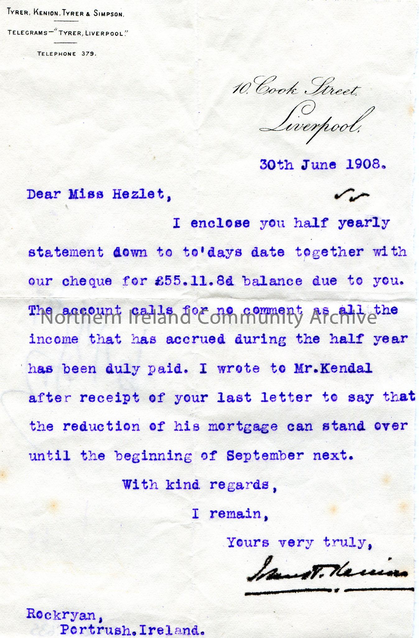 Typed letter to Miss Hezlet at Rockryan, Portrush, Ireland re Kendall’s mortgage. Encloses half yearly statement along with a cheque for £55.11.8…