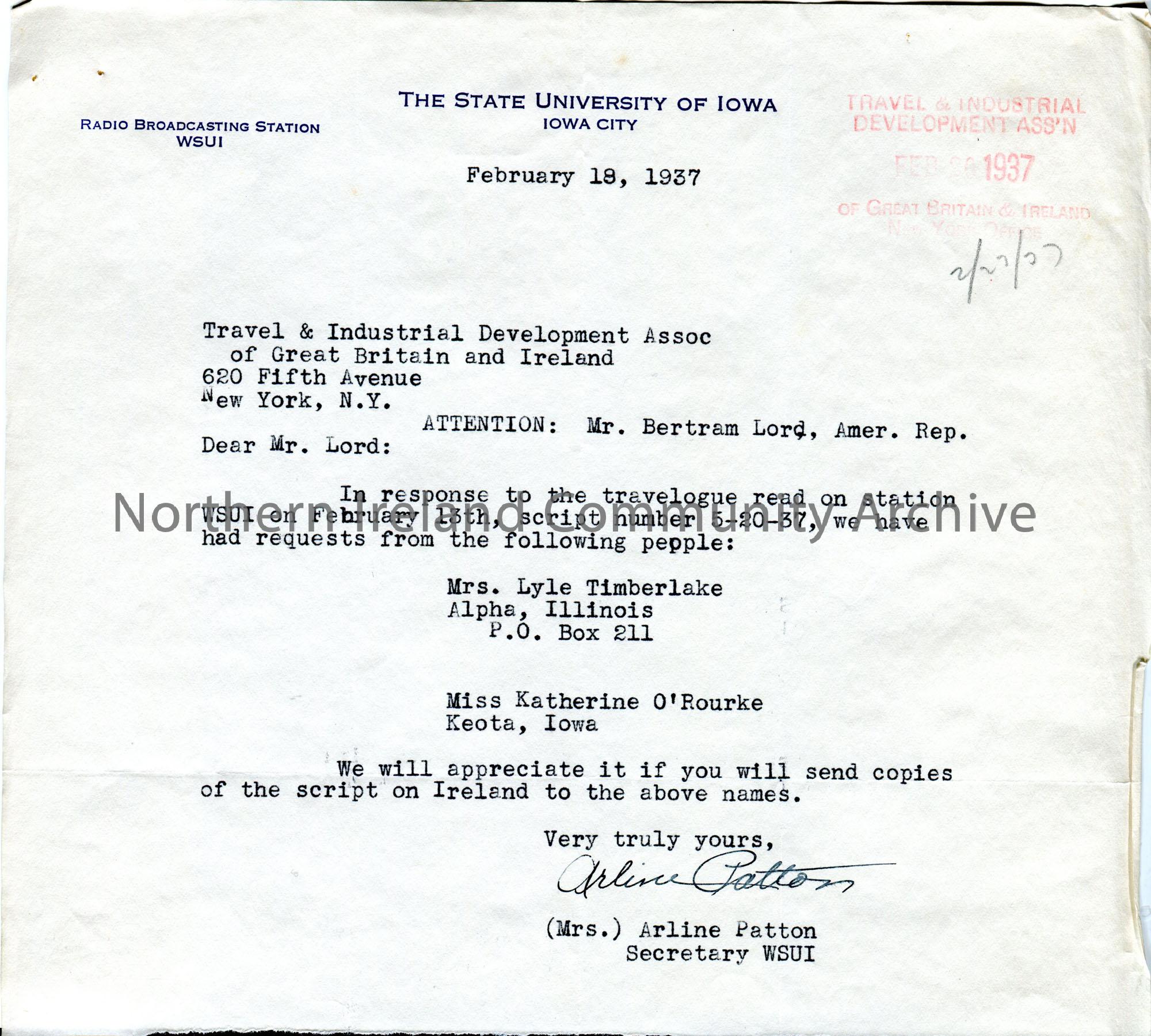 Typed letter to Mr Bertram Lord, Travel & Industrial Development Association from Mrs Arline Patton. Copies of script '5-20-37' of travelogue read on station WSUI 13th February, 1937 to be sent to Mrs Lyle Timberlake and Miss Katherine O'Rourke.