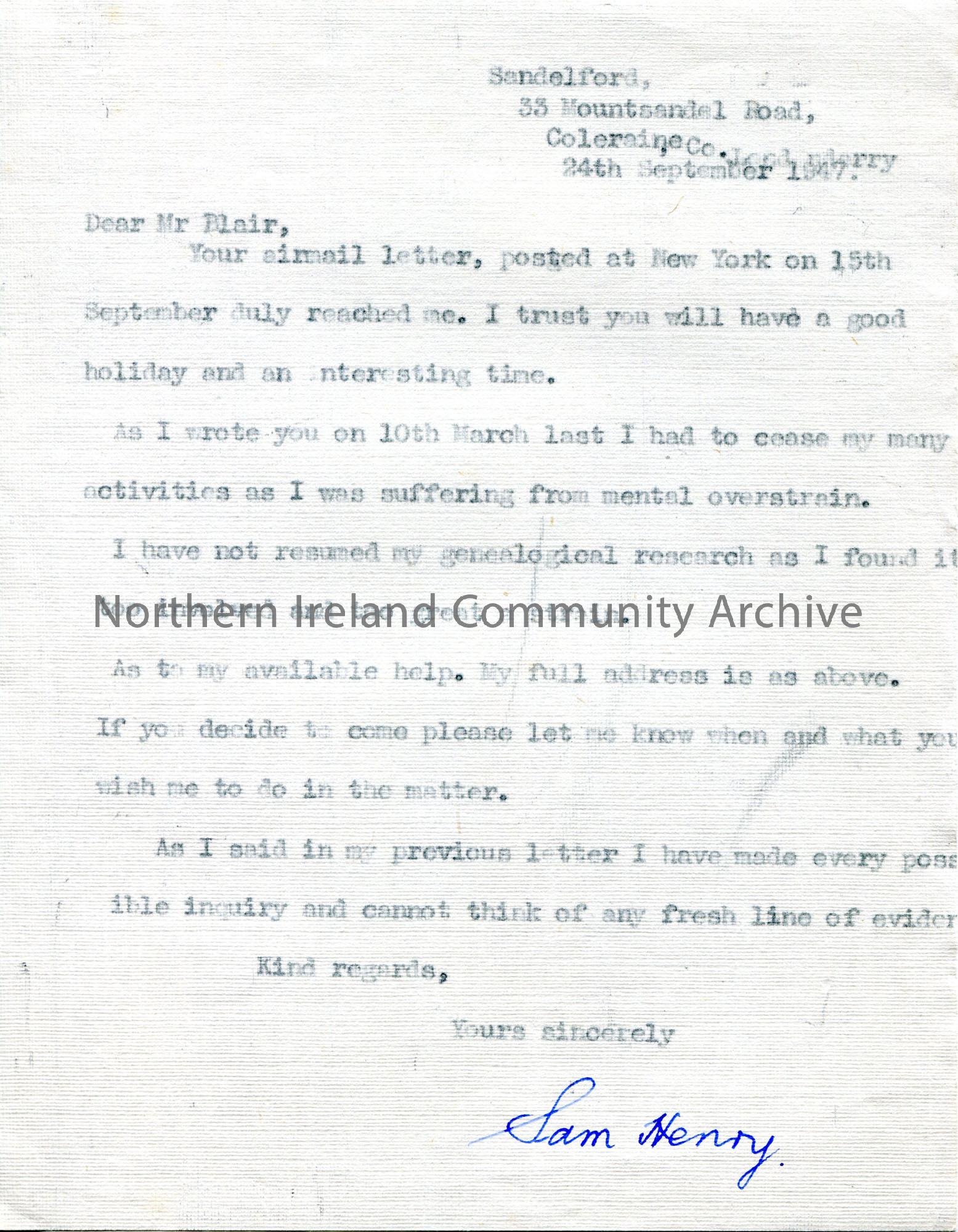 Typed letter to Mr Blair and signed by Sam Henry. Informing Mr Blair that he was suffering from 'mental overstrain' and has not resumed his genealogical research as a result.