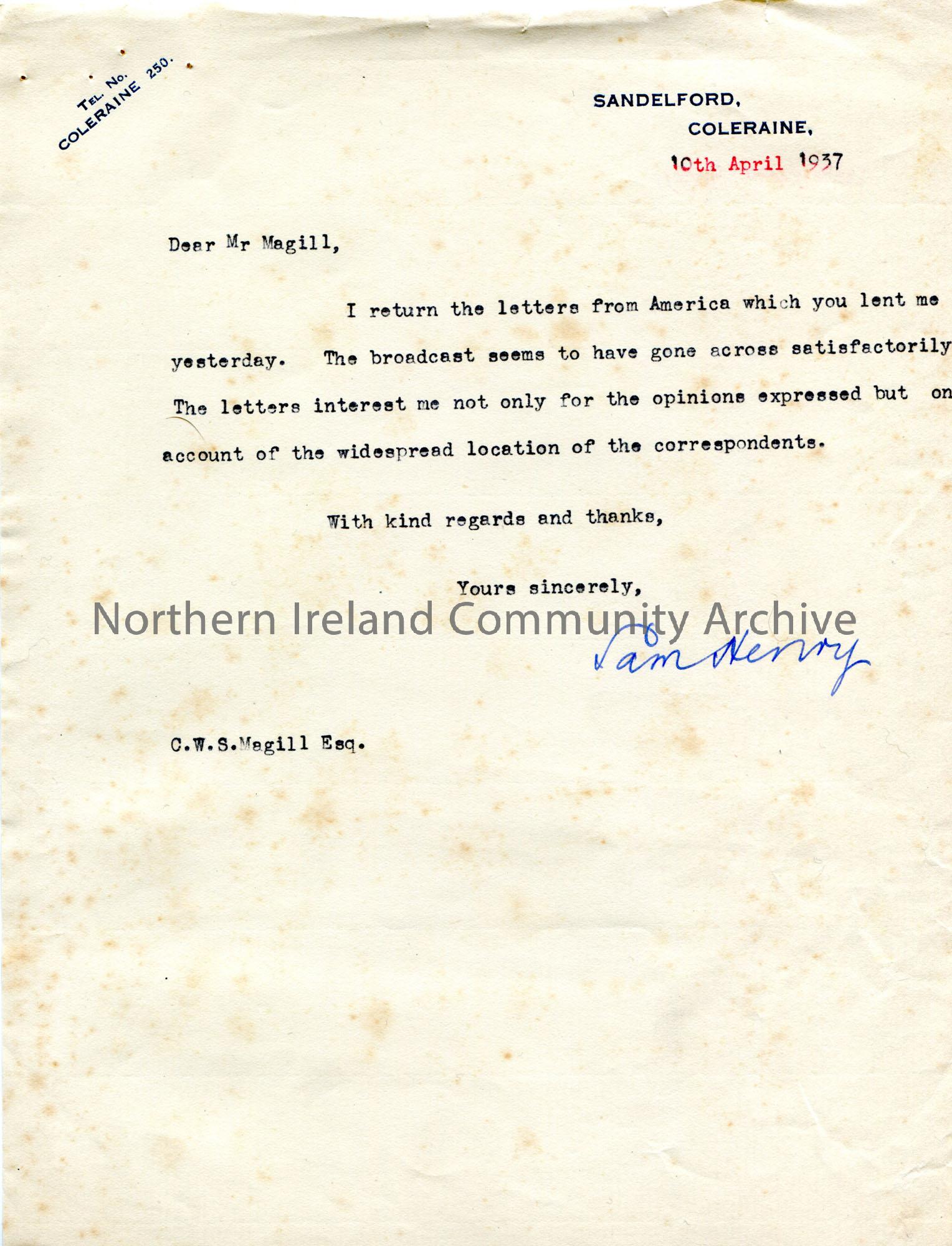 Typed letter to Mr C. W. S. Magill from Sam Henry. Sam is returning letters from America re a broadcast and was particularly interested in the ‘widesp…