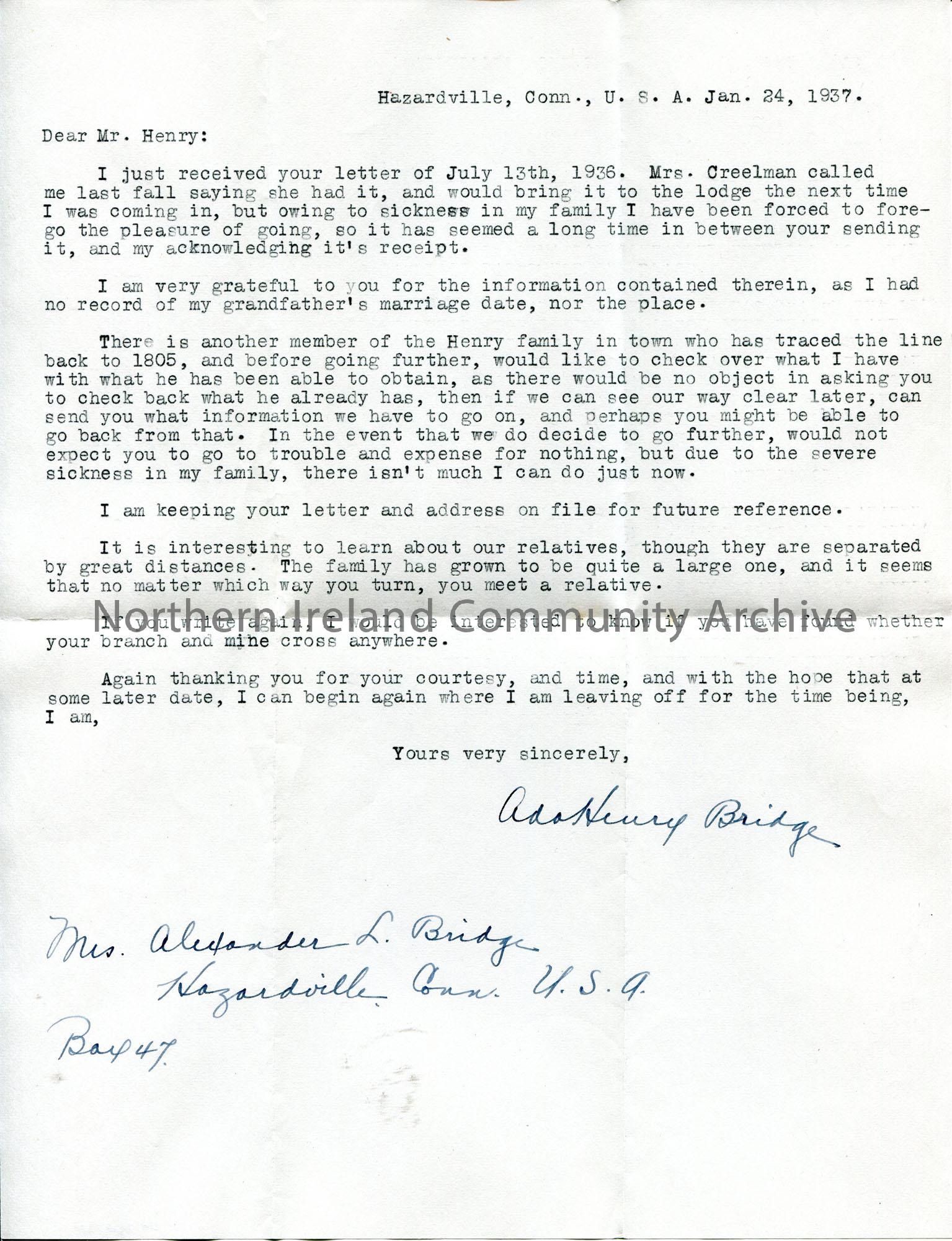 Typed letter to Mr Henry from Ada Henry Bridge. There has been a delay in replying to Sam's letter of 1936 due to illness in the family. Sam had sent information re their family history. Thanks him for his research.