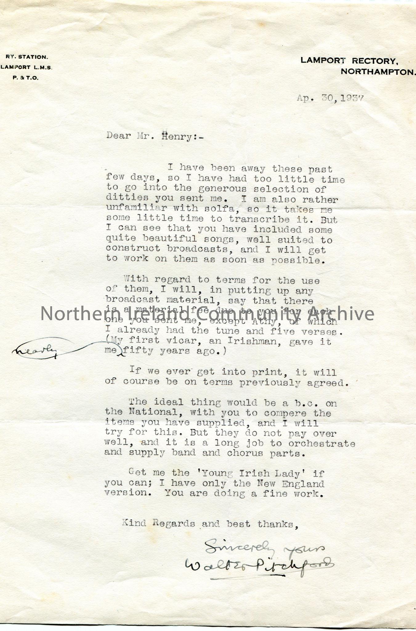 Typed letter to Mr Henry. Thanks Sam for sending the songs. Writes re the fees for the songs if used in a programme. Suggests a broadcast on the National. Asks for a version of 'Young Irish Lady'.