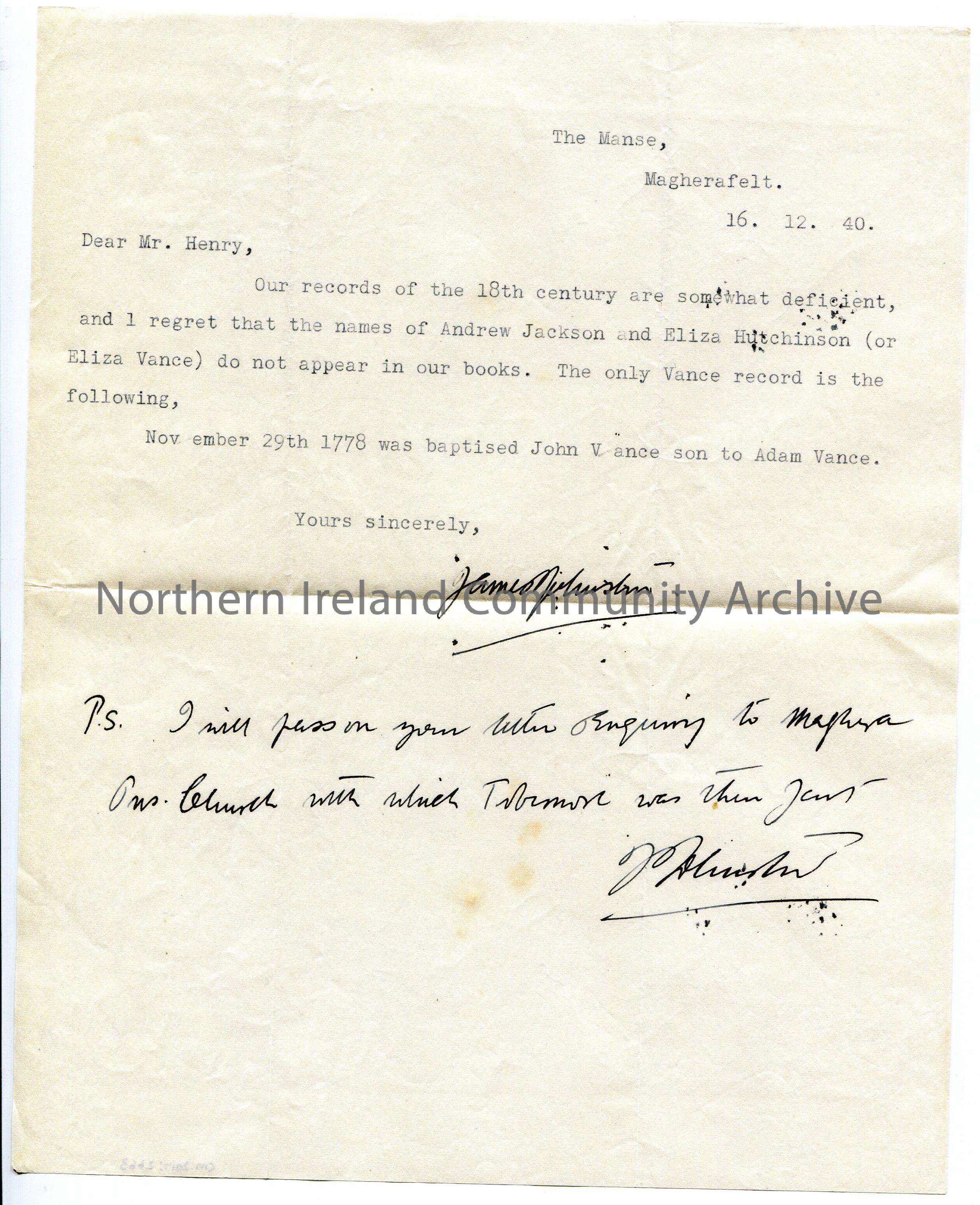 Typed letter to Mr Henry. They have searched their records of the 18th century and have not found the names of Andrew Jackson or Eliza Hutchinson. Notes that they did find a reference to John Vance. Handwritten post script re Maghera Church.