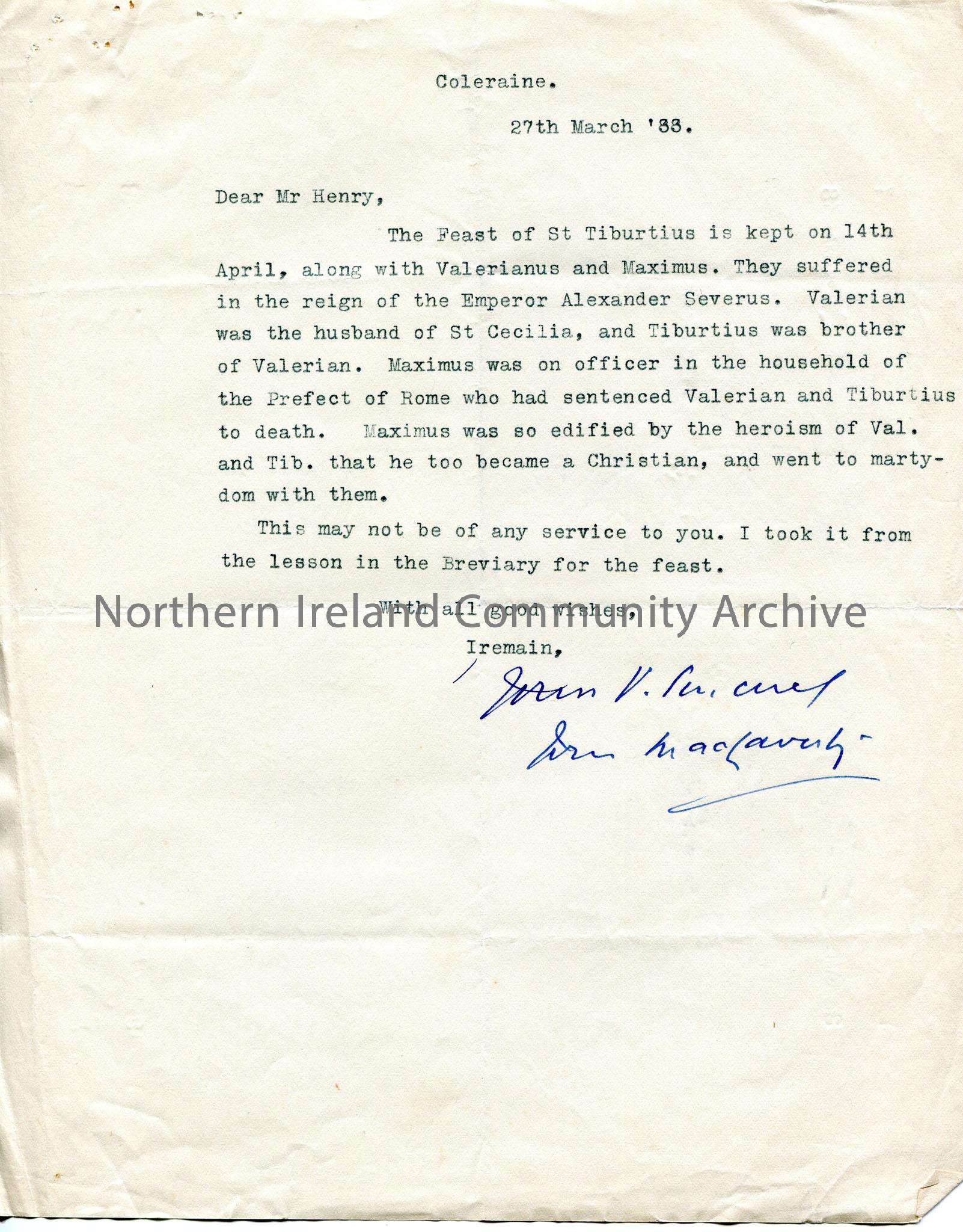Typed letter to Mr Henry. Writing re Christian martyrs St Tiburtius, Valerianus and Maximus during the reign of Emperor Alexander Severus in the Roman Empire.