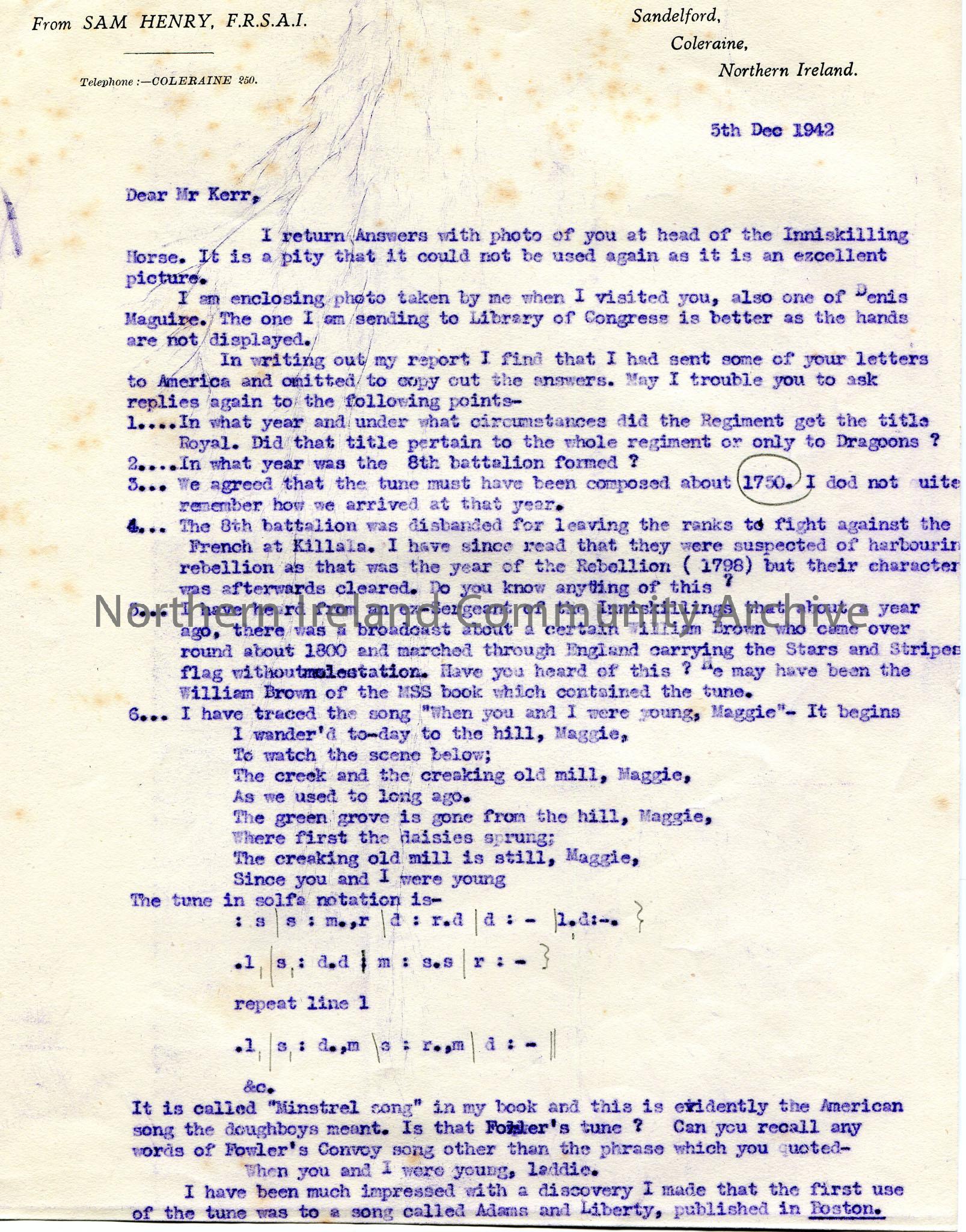 Typed letter to Mr Kerr. Returns Answers with photo of Mr Kerr at head of Inniskilling Horse. Encloses another photo of Mr Kerr taken by Sam Henry and another of Denis Maguire. List of 6 questions for Mr Kerr re the Royal Inniskillings and the song 'The Star Spangled Banner'. Includes tonic-fa notation to 'When you and I were young Maggie' and the tune is called 'Minstrel Song'. Asks for information re Fowler's Convoy song.
