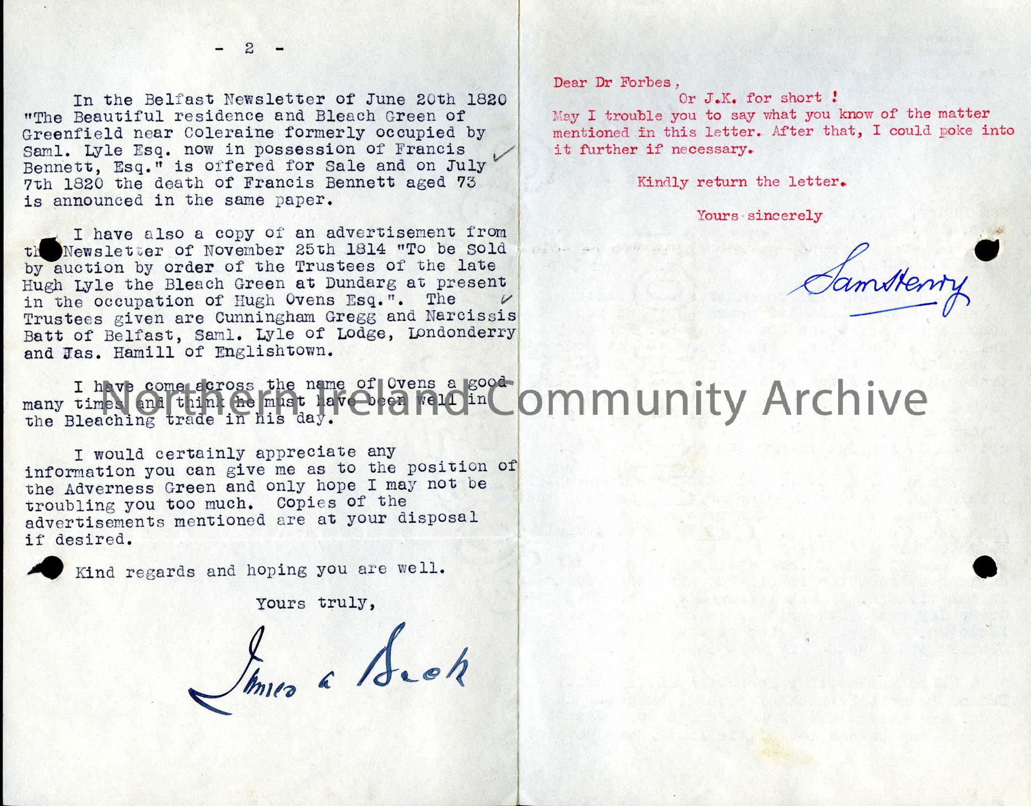 Typed letter to Mr Sam Henry from James A. Beck regarding a conversation which they had previously had regarding the linen trade in Coleraine and extending a query to include Ardverness and Dundarg. Dated 24.03.1943. The letter has a postscript in red type signed by Sam Henry, forwarding the query onto a Dr Forbes.
