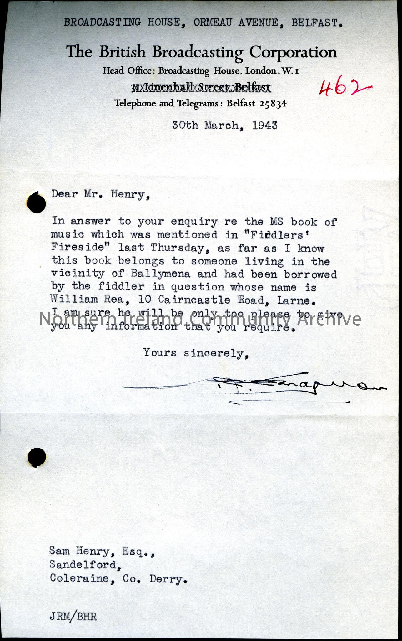 Typed letter to Mr Sam Henry from the BBC regarding his previous letter in which he enquired about the MS book of music mentioned in “Fiddlers’ Firesi…