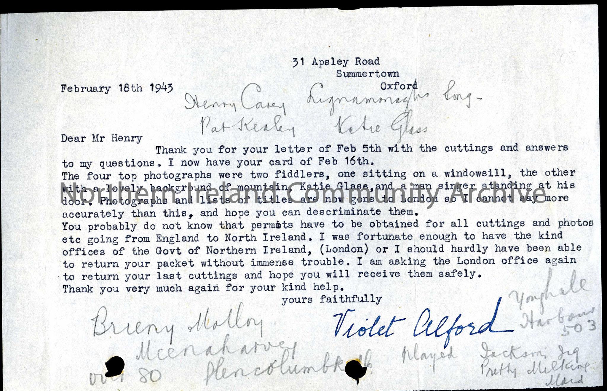 Typed letter to Mr Sam Henry from Violet Alford, thanking him for his letter dated Feb 5th, 18.02.1943, describing the people portrayed in four photographs and relating that permits have been gained for the return of photos and cuttings from london to Northern ireland. Dated 18.02.1943