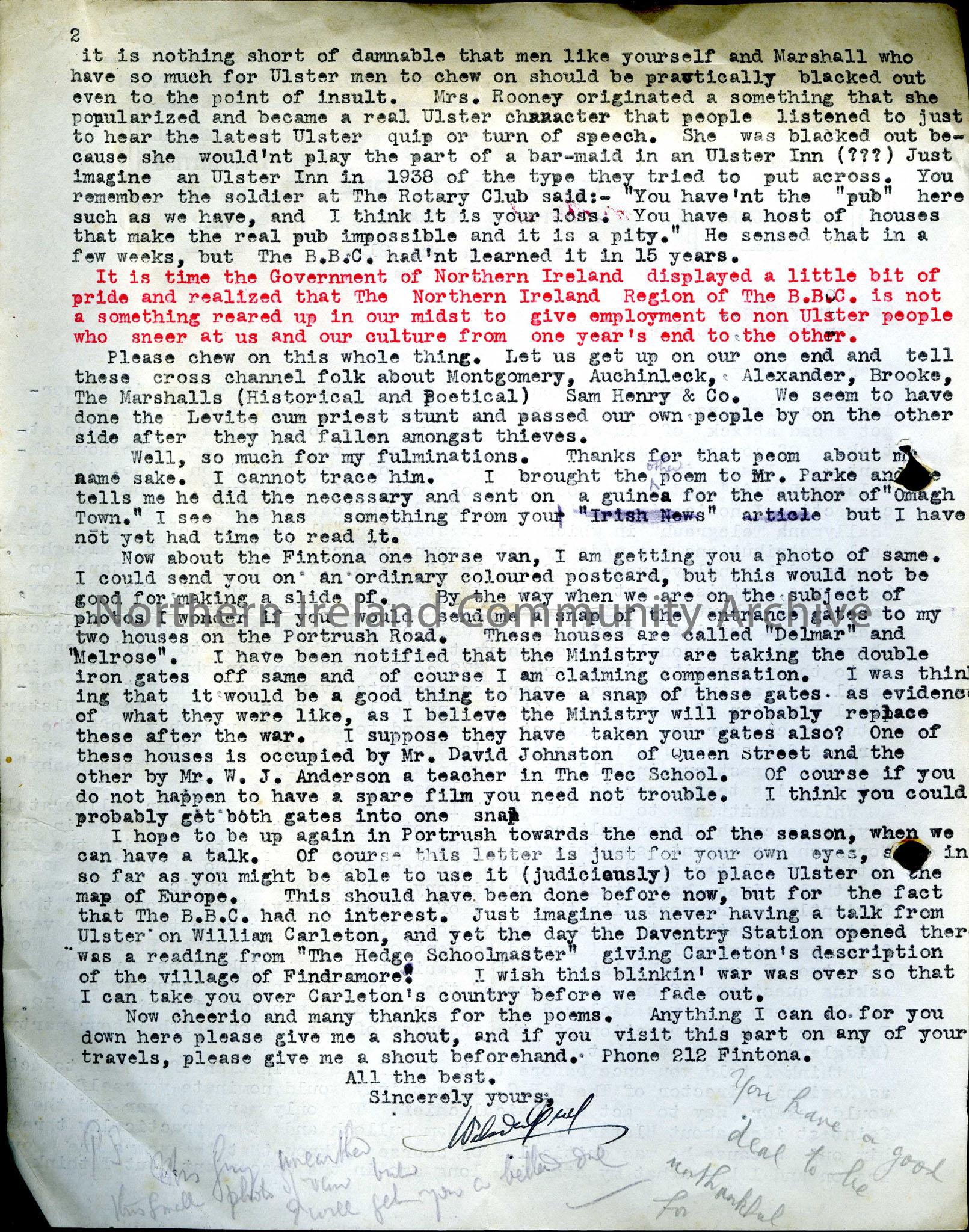 Typed letter to Mr Sam Henry from Wilson Guy attacking an apparent BBC policy to remove regional dialects from the radio. In red type is written "It is time the government of Northern ireland displayed a little bit of pride and realized that the Northern ireland Region of the B.B.C. is not a something reared up in our midst to give employment to non Ulster people who sneer at us and our culture from one year's end to the other." Guy proceeds to request a photo of his iron gates which are to be removed by the government as part of the war effort.