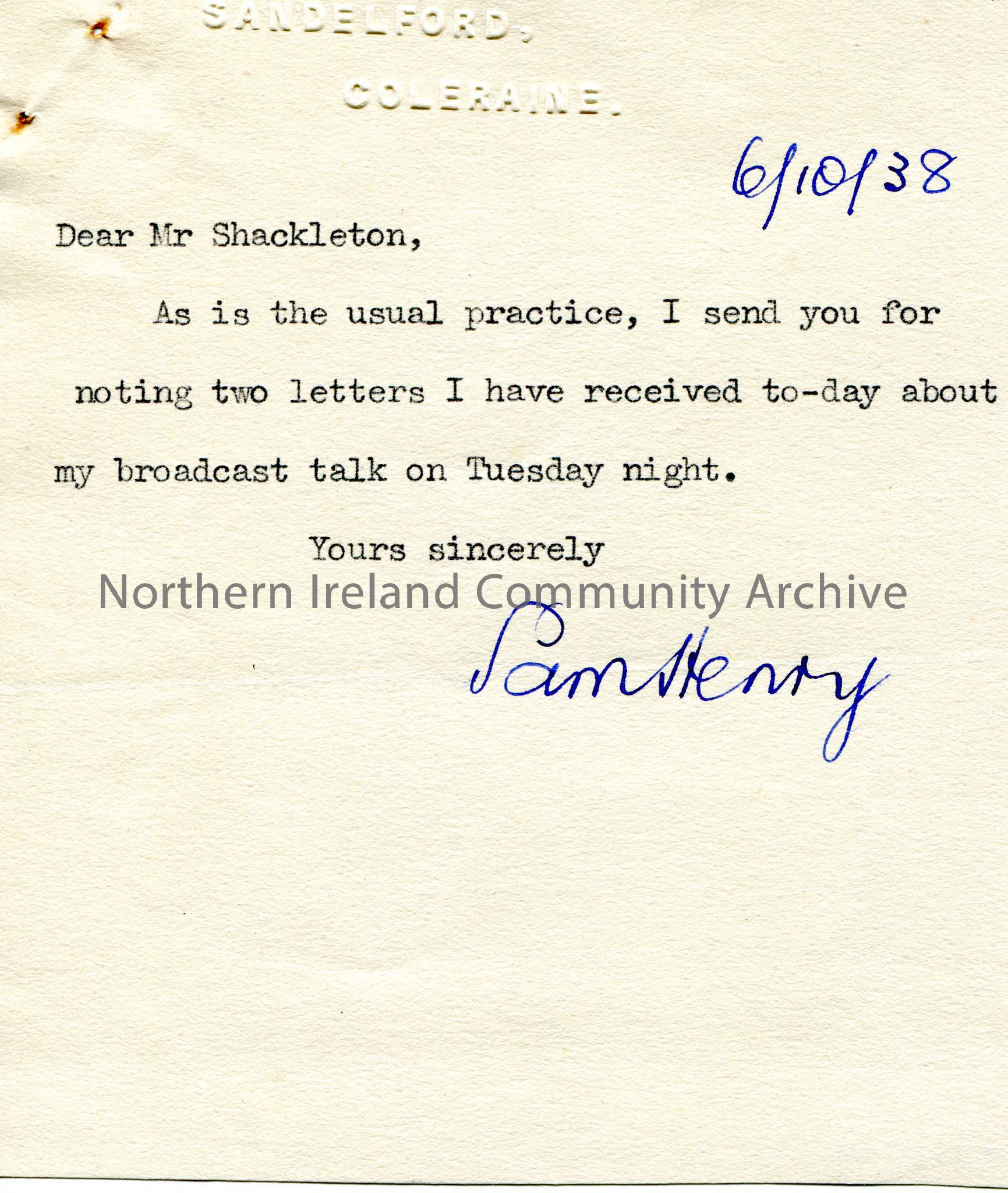 Typed letter to Mr Shackleton. Paper cut from a larger page. A short note to confirm Sam received two letters re broadcast on Tuesday night.