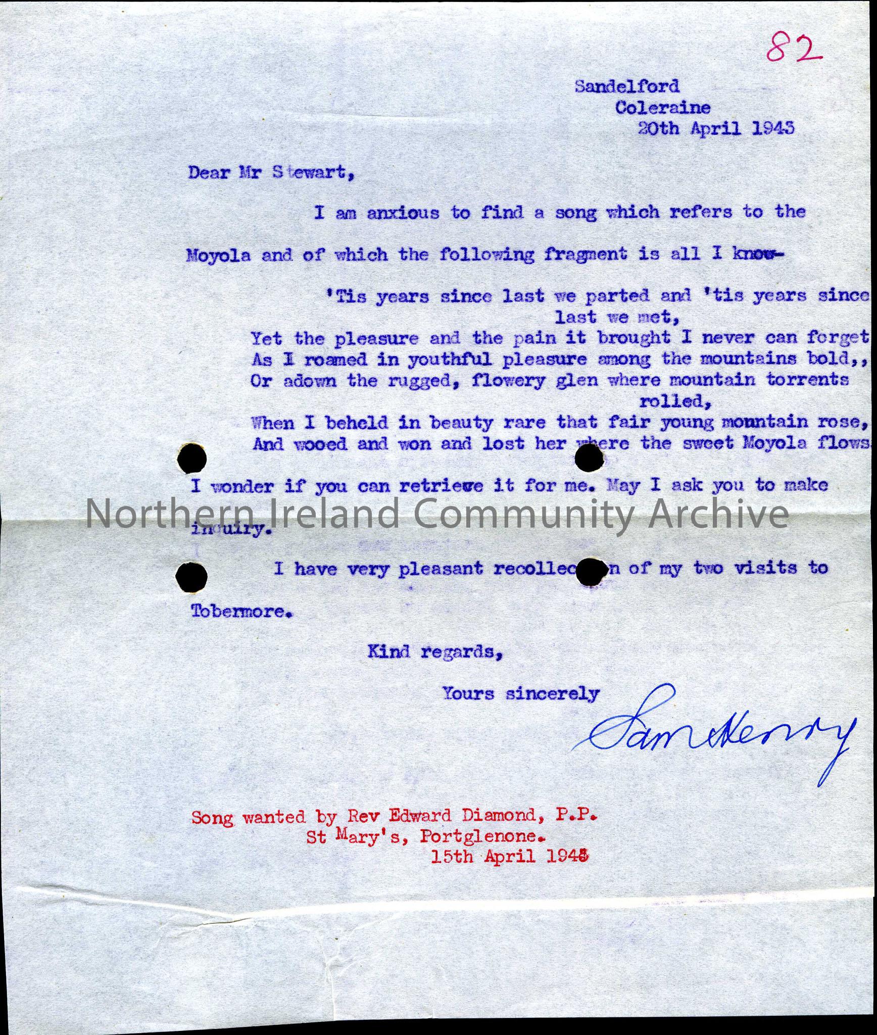 Typed letter to Mr Stewart from Mr Sam Henry requesting information on a song which refers to the Moyla. Dated 20.04.1943.