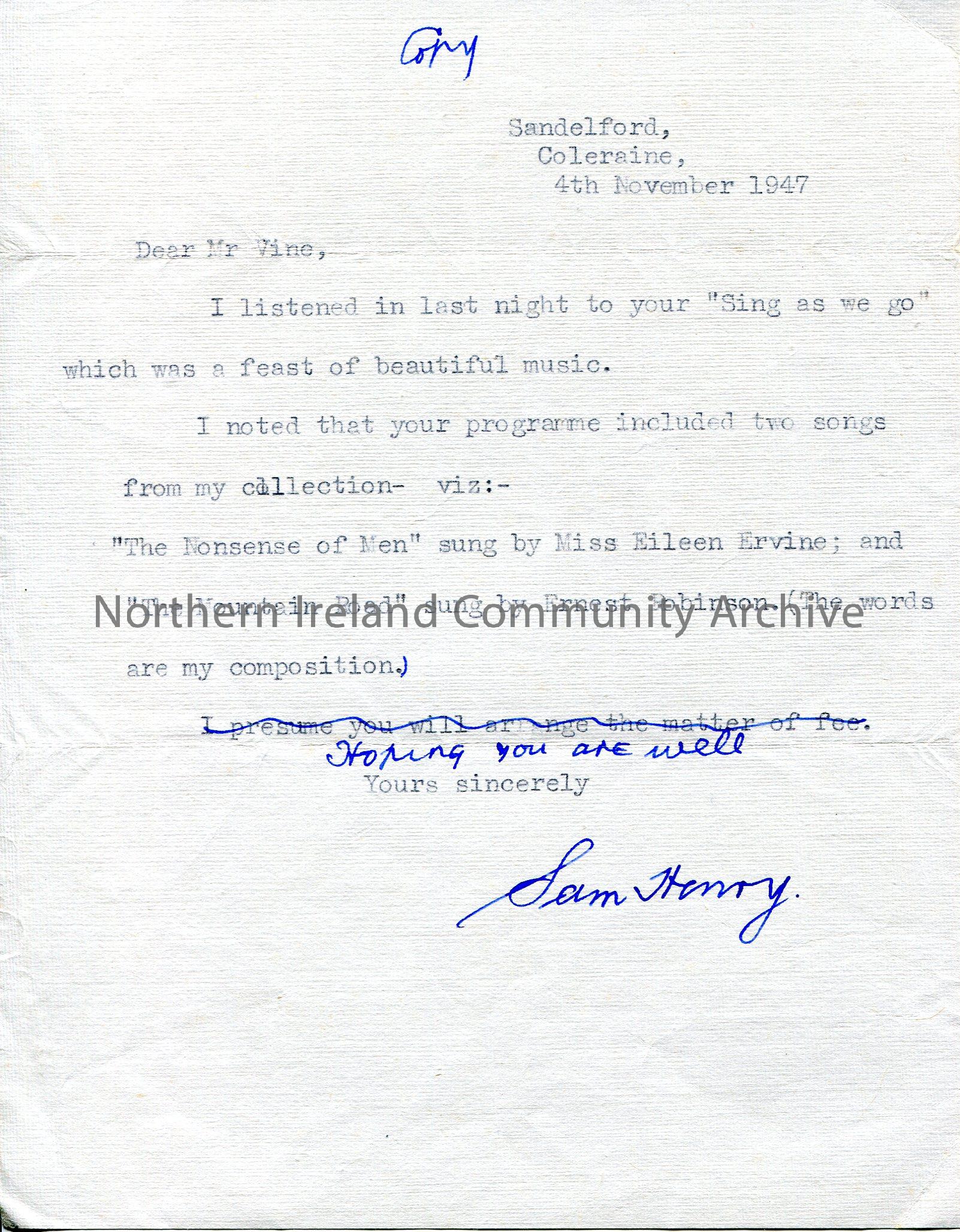 Typed letter to Mr Vine from Sam Henry. Headed 'Copy' at top of page. Refers to two songs played in Mr Vine's programme 'The Nonsense of Men' sung by Eileen Ervine and 'The Mountain Road' sung by Ernest Robinson, words composed by Sam. Sam mentions fees for the songs but it is scored out and replaced with 'Hoping you are well'.