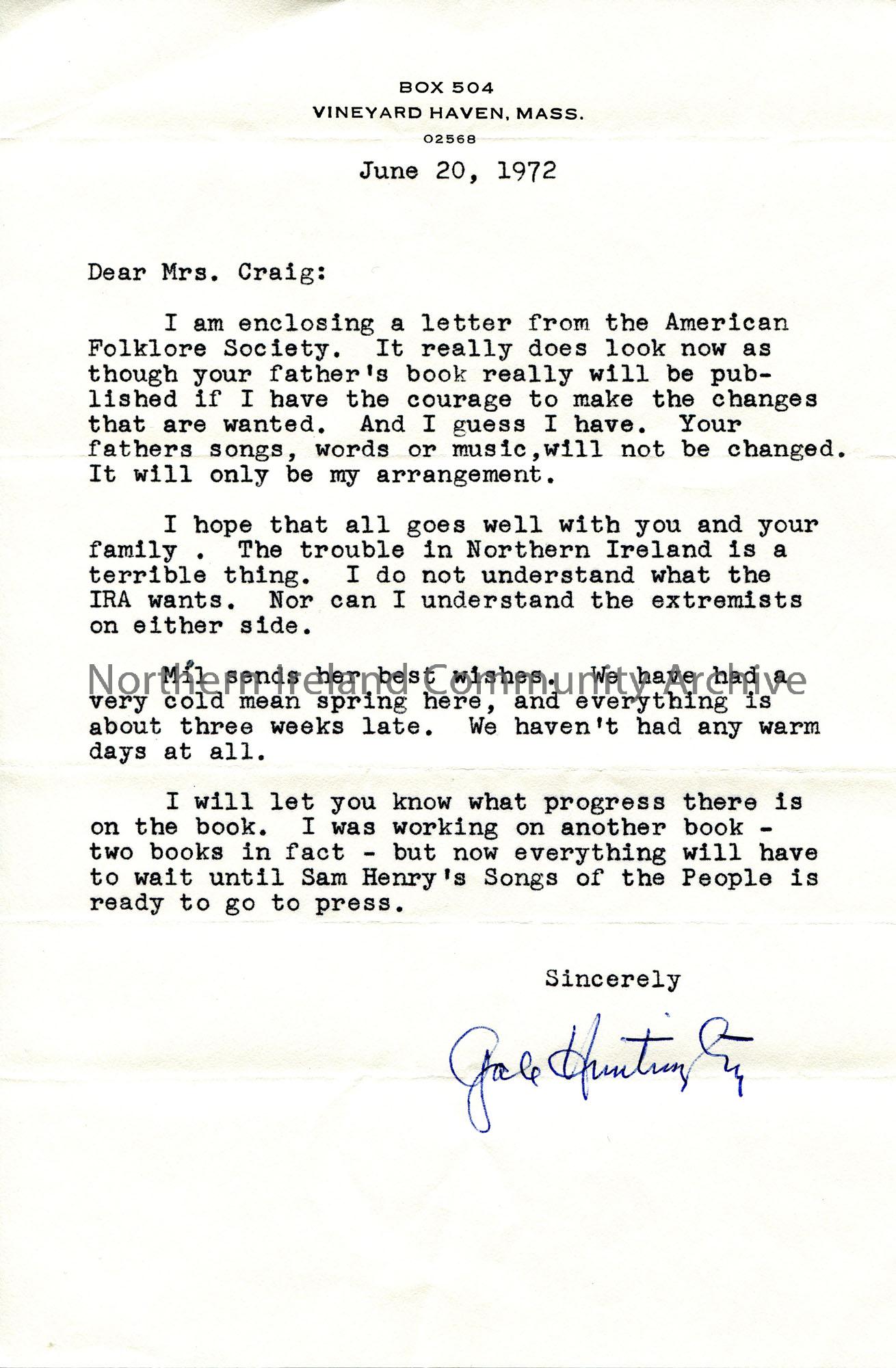 Typed letter to Mrs [Olive] Craig from Gale Huntington. Encloses letter from American Folklore Society. Informing Olive that Sam's book of folk songs will be published. He will inform Olive of the progress of the book. Comments on the current troubles in Northern Ireland and the weather in Massachusetts.
