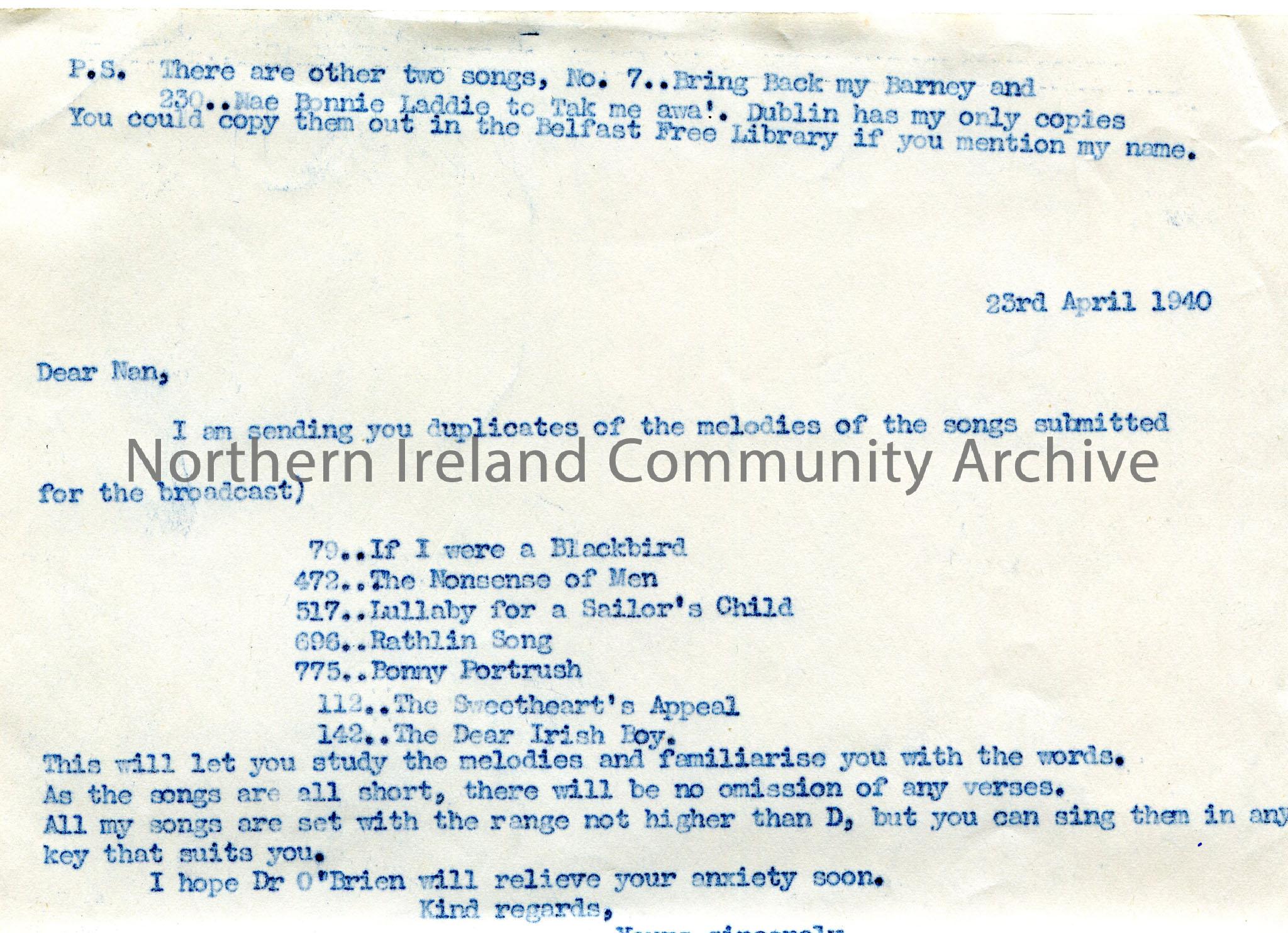 Typed letter to Nan from Sam Henry. Sending duplicates of melodies for broadcast- "If I were a Blackbird", "The Nonsense of Men", "Lullaby for a Sailor's Child", "Rathlin Song", "Bonny Portrush", "The Sweethearts Appeal" and "The Dear Irish Boy".