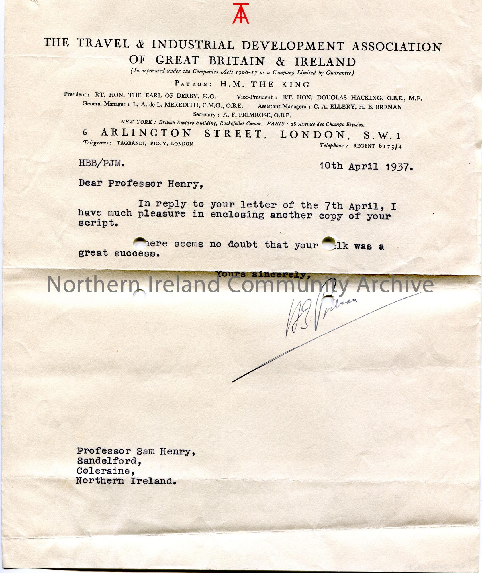 Typed letter to ‘Professor Sam Henry’, Sandelford, Coleraine, on headed paper. Encloses another copy of Sam’s script and notes that the talk was a ‘gr…
