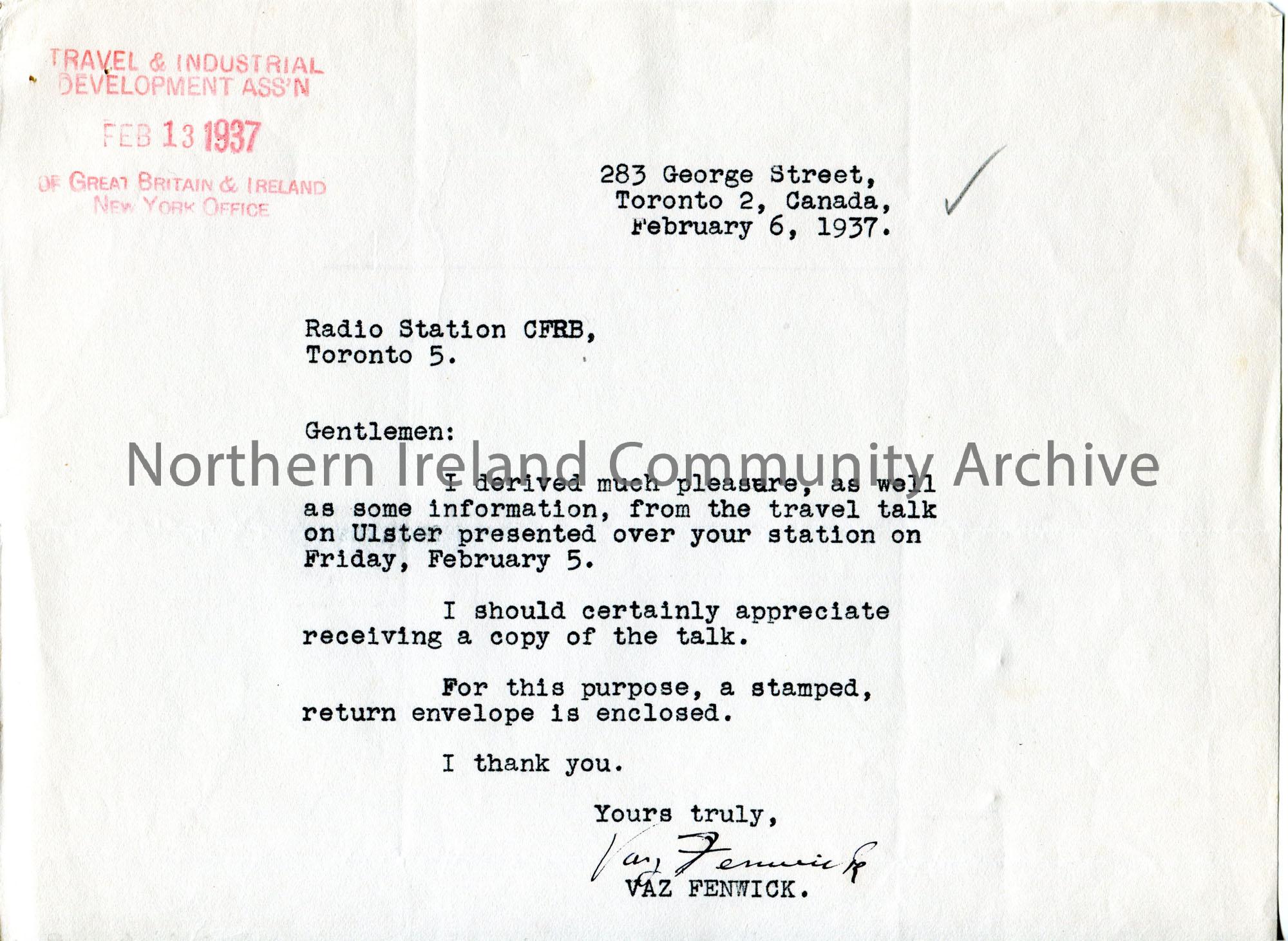Typed letter to Radio Station C.F.R.B from Vaz Fenwick. Requests a copy of the travel talk on Ulster broadcast on 5th February, 1937.