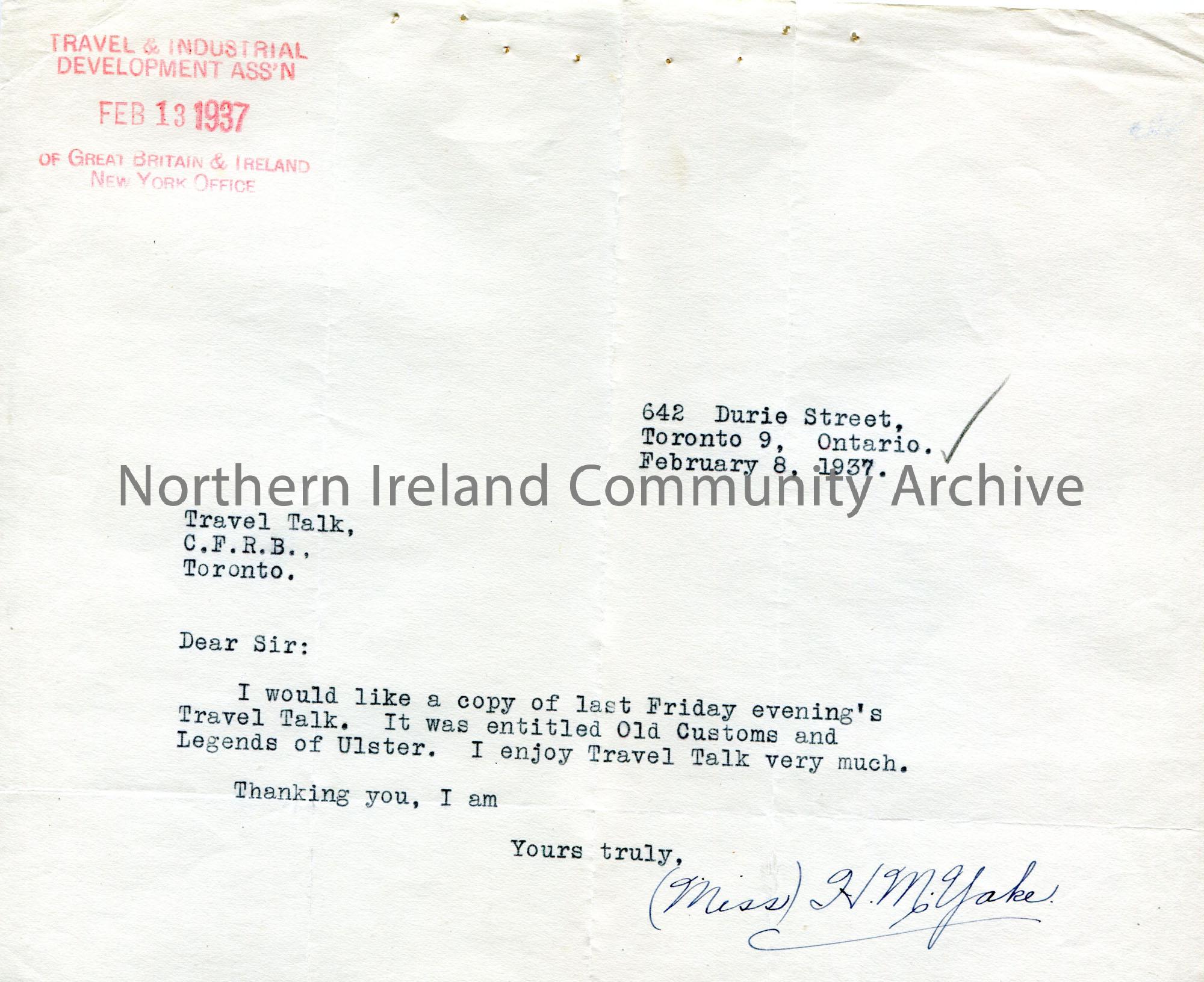Typed letter to Radio Station C.F.R.B. Toronto from Miss H M Yake. She requests a copy of a talk titled 'Old Customs and Legends of Ulster' broadcast last Friday evening.