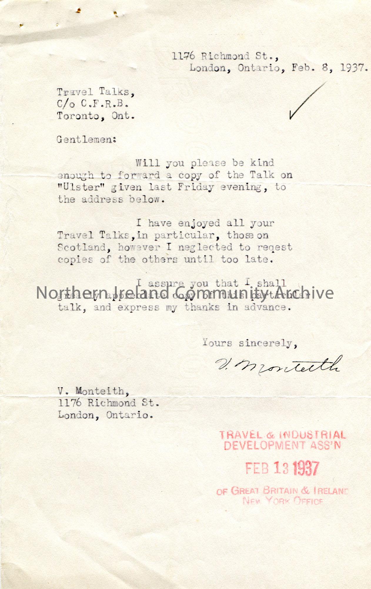 Typed letter to Radio Station C.F.R.B. Toronto from V. Monteith. Requests copy of a Talk on Ulster given on Friday evening over the station.