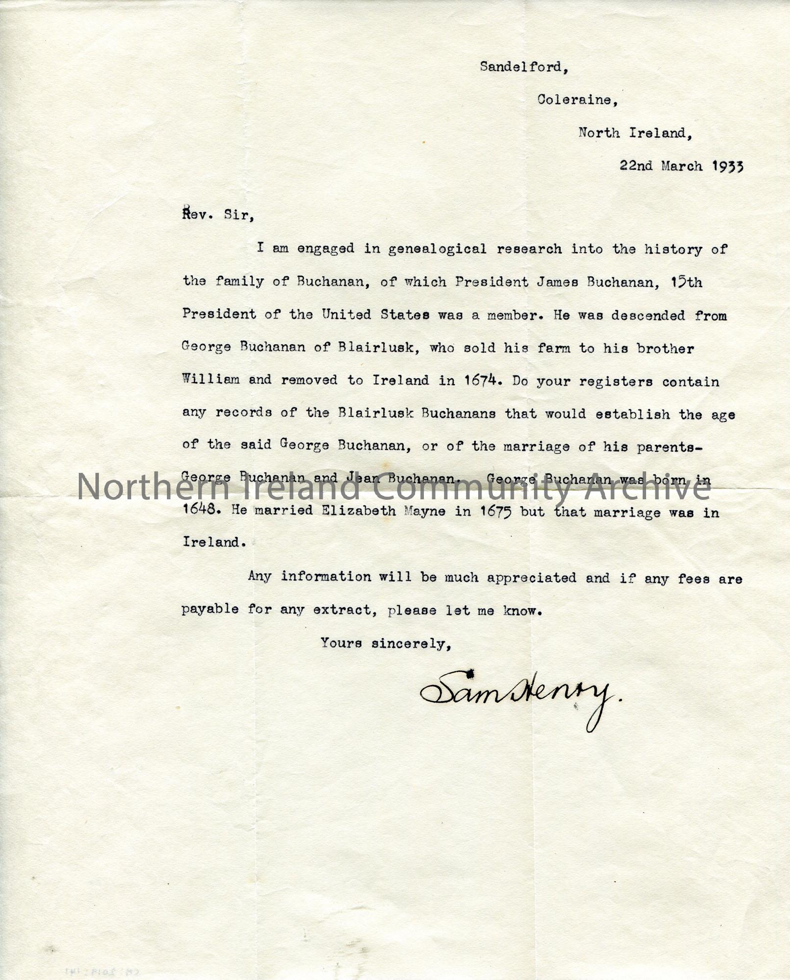 Typed letter to 'Rev. Sir' from Sam Henry. Requesting family history information re the Buchanan family, of which President James Buchanan of America was a member.