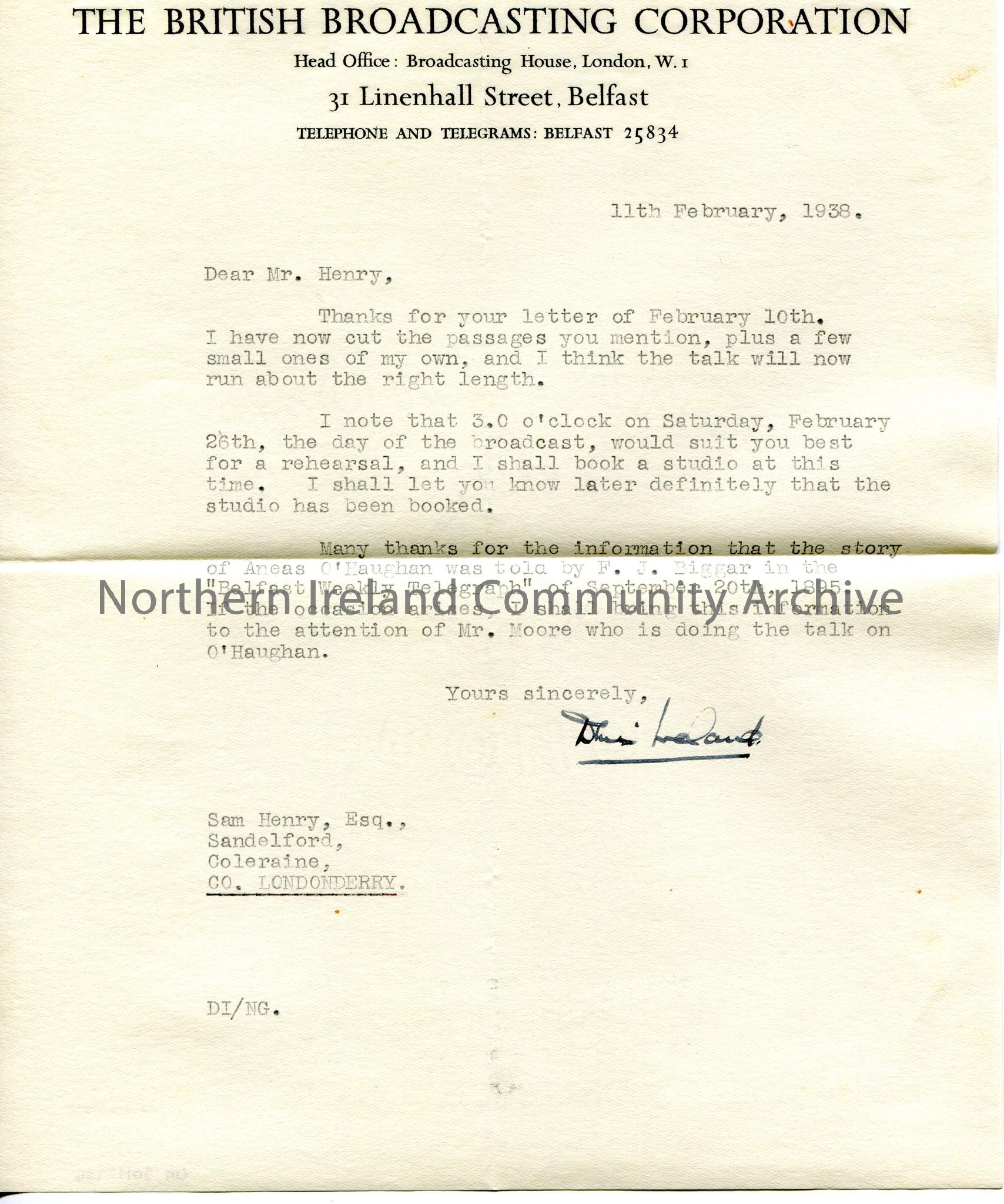 Typed letter to Sam Henry, addressed to Sandelford, Coleraine, on headed paper. Dated 11th February, 1938. Has made amendments to Sam's script on Shane Crossagh. Rehearsal to take place Saturday, 26th February at 3 o'clock. Thanks Sam for information on story of Aneas O'Haughan by F.J.Biggar. Mr Moore to do talk on O'Haughan.