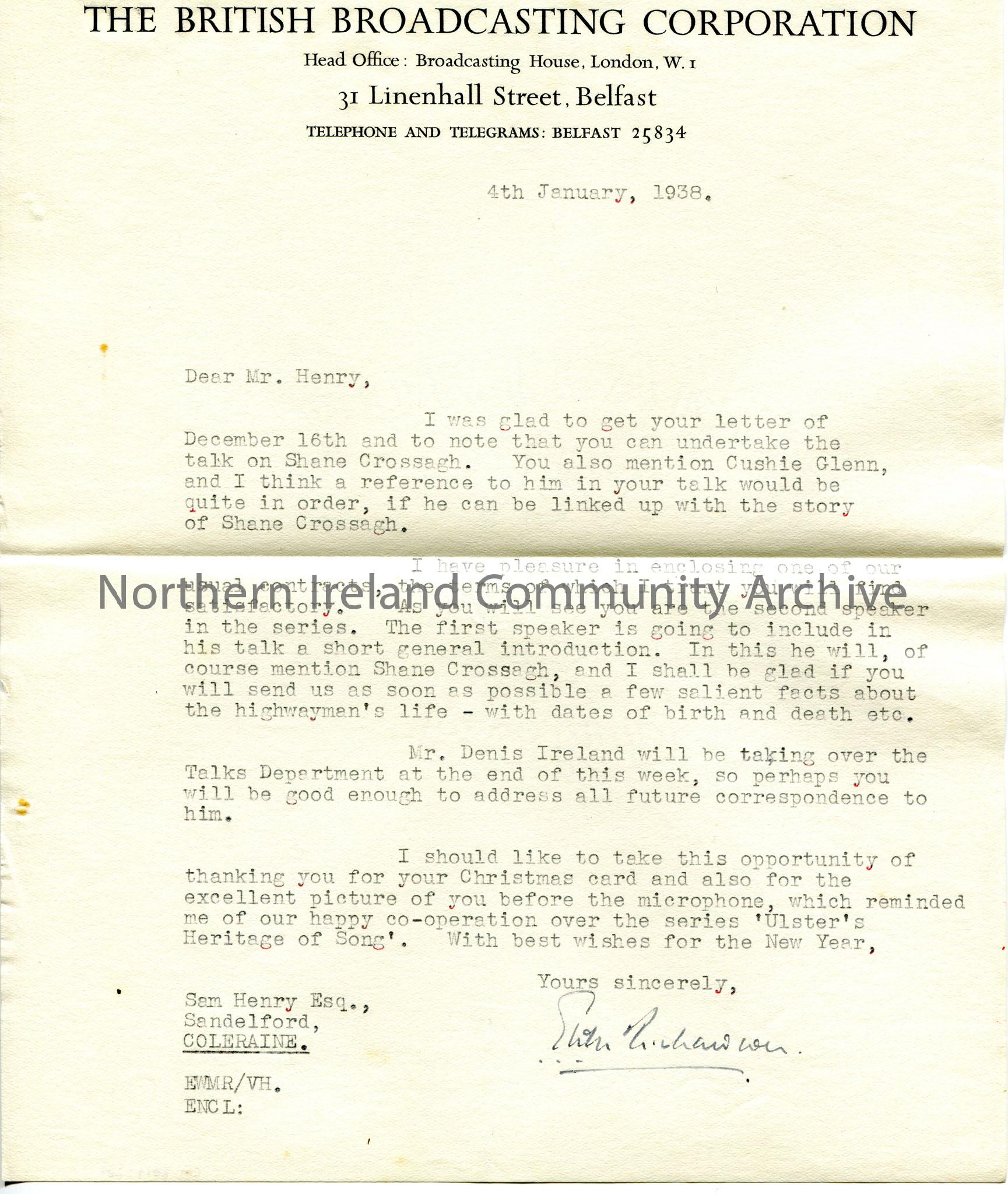 Typed letter to Sam Henry, addressed to Sandelford, Coleraine, on headed paper. Dated 4th January, 1938. Sam to undertake talk on Shane Crossagh and to mention Cushie Glen in the talk. linking him to Shane Crossagh. Encloses a contract for the talk. Sam to send in some facts re Shane Crossagh. Mr Denis Ireland to take over the talks department, Sam to write to him from next week. Thanks Sam for Christmas card and picture of himself.