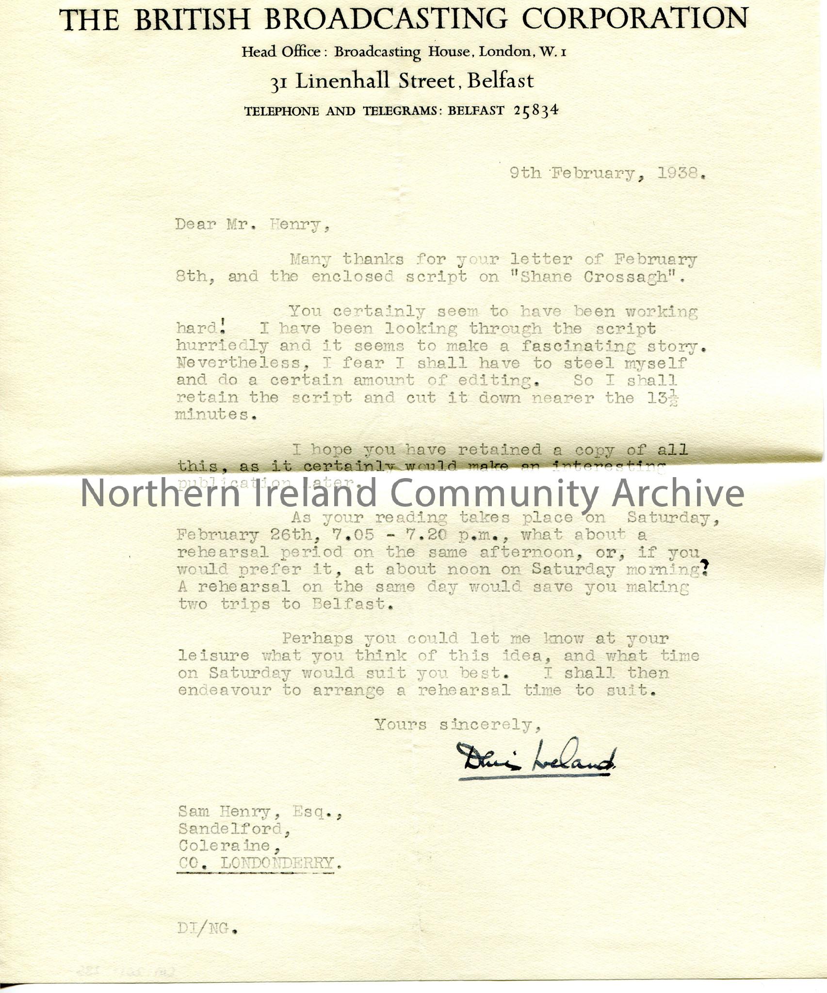 Typed letter to Sam Henry, addressed to Sandelford, Coleraine, on headed paper. Dated 9th February, 1938. Thanks Sam for letter and for sending the script of Shane Crossagh. Denis to cut script down to 13.5 minutes. Makes arrangements for a rehearsal.