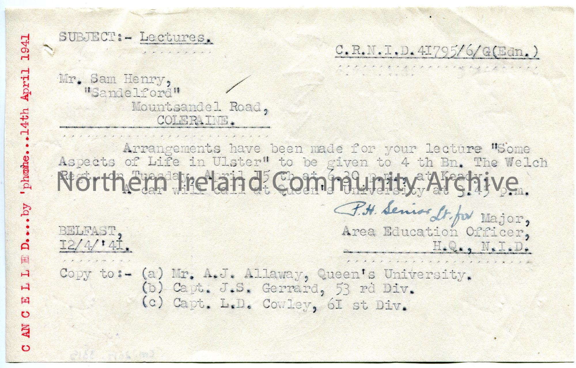Typed letter to Sam Henry. Confirming arrangements for Sam's lecture 'Some Aspects of Life in Ulster' at Keady on 15th April to 4th Bn. [Battalion] The Welsh Regt [Regiment]. Typed in red on left side 'Cancelled...by 'phone...14th April 1941'.