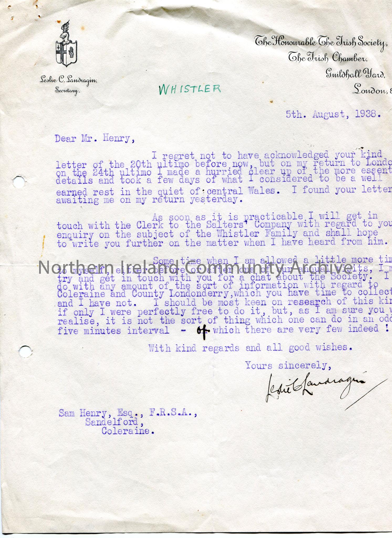 Typed letter to Sam Henry, dated 5th August, 1938. Regrets late reply due to a trip to central Wales. Writing re Sam's enquiry about the Whistler family and to get in touch with the Clerk to the Salters' Company. Would like to chat to Sam re the Society and information on Coleraine and County Londonderry.