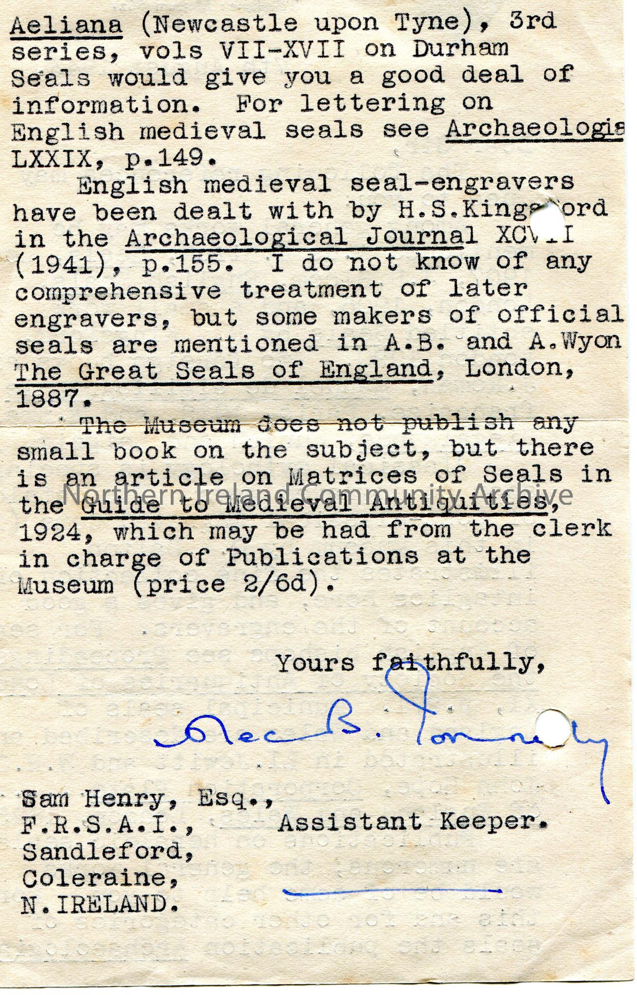 Typed letter to Sam Henry, Esq, F.R.S.A.I, Sandelford, Coleraine, N.Ireland. Provides Sam with references such as journals and books re Seals. Mentions English seals, heraldic seals, medieval seal-engravers.