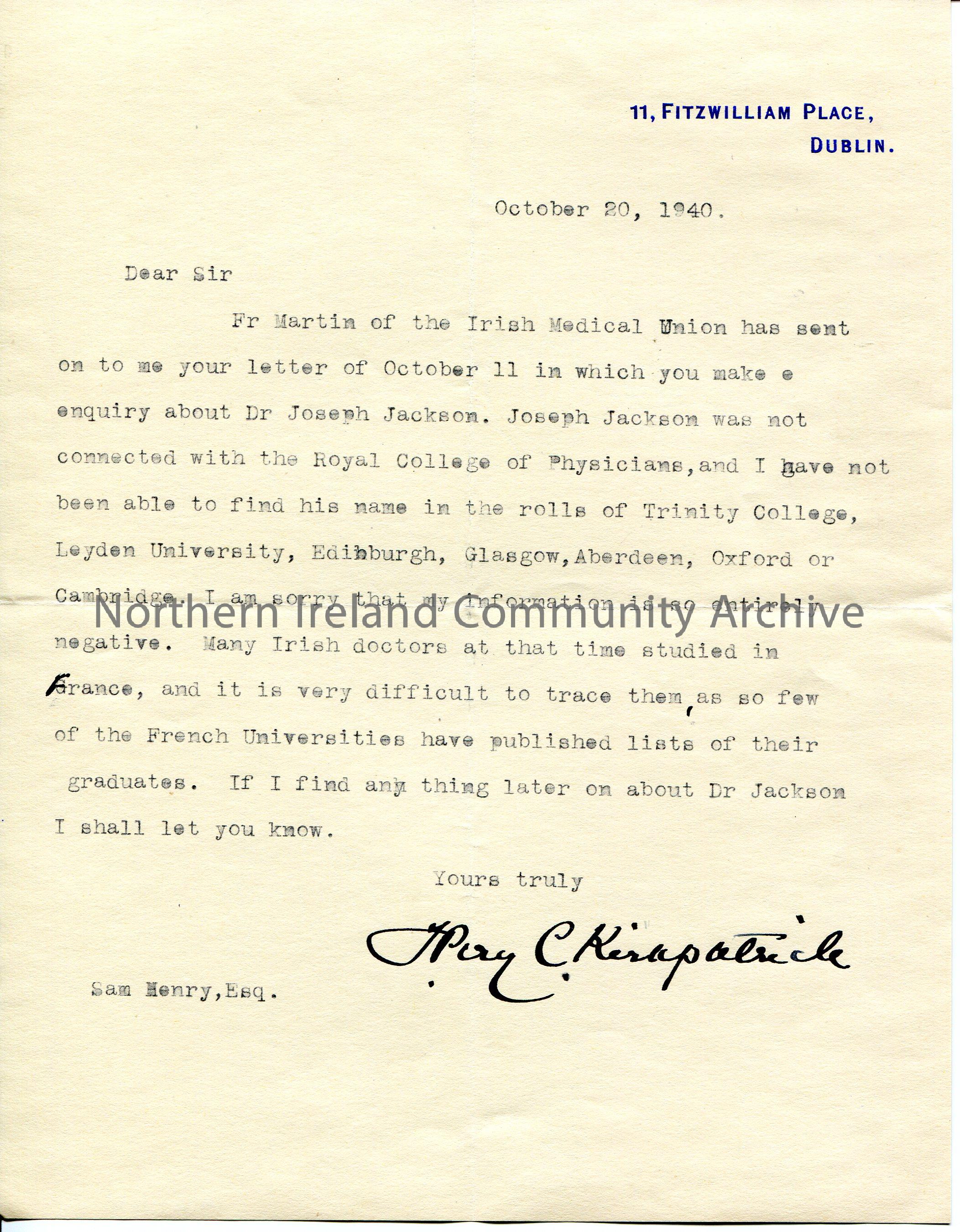 Typed letter to Sam Henry, Esq. They have completed a search for Dr Joseph Jackson in the rolls of Trinity College, Leyden University, Edinburgh, Glasgow, Aberdeen, Oxford and Cambridge. Informs Sam they have not found anything connected with Joseph Jackson.