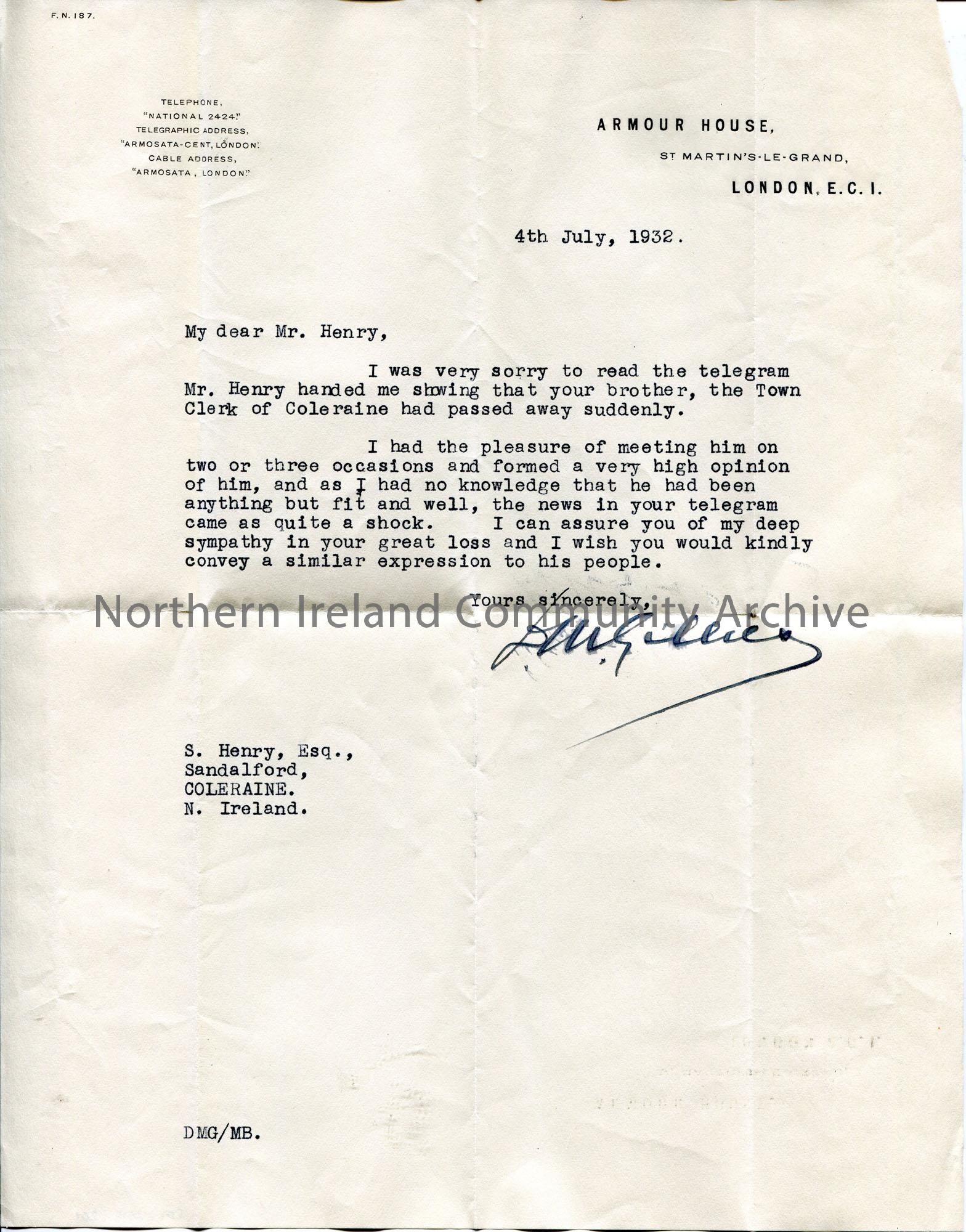 Typed letter to Sam Henry. Expresses sympathies to Sam on the sudden death of his brother, William, Town Clerk.