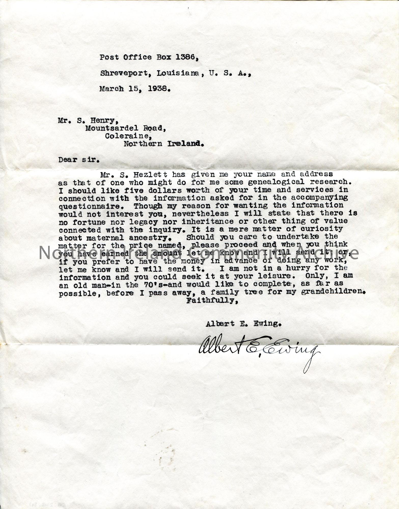 Typed letter to Sam Henry from Albert Ewing. Sam's details were passed to him from Mr S Hezlett re genealogical research. Asks Sam to help research his maternal side for a fee of $5 to create a family tree for his grandchildren.