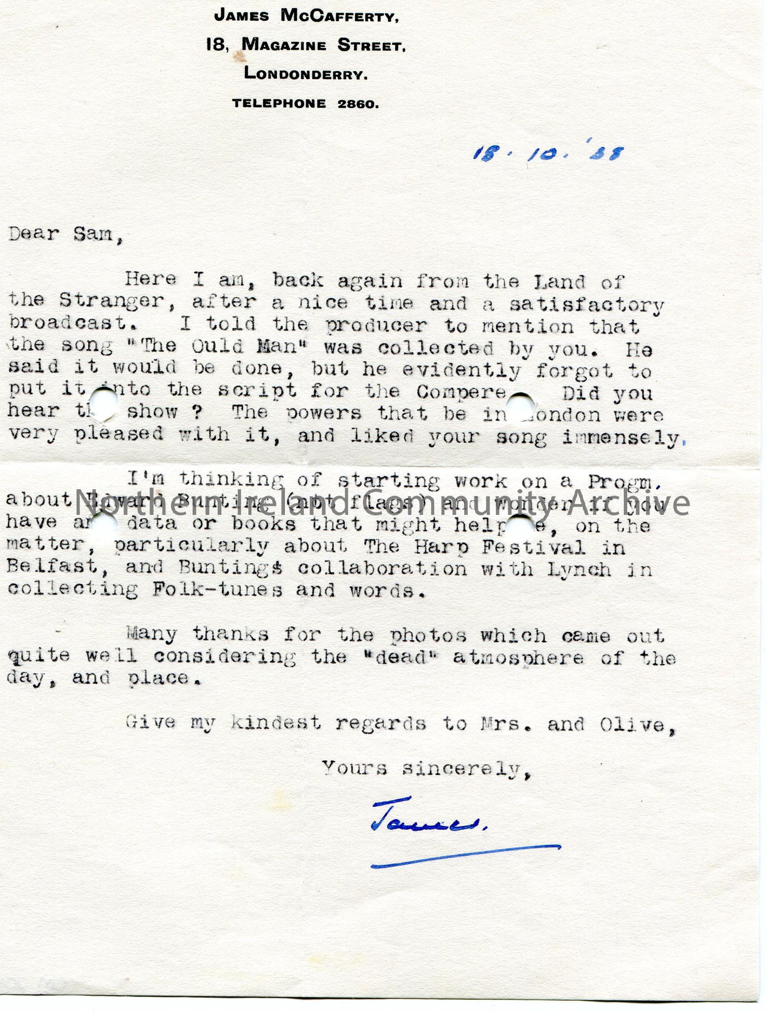 Typed letter to Sam Henry from James McCafferty. Addressed from 18 Magazine Street, Londonderry. Dated 18th October, 1938. Writes re a broadcast in the Land of the Stranger. Sam's song, "The Ould Man" was played in the broadcast. He is thinking of starting work on a programme re Edward Bunting and asks Sam is he has any information, particularly re The Harp Festival in Belfast and Bunting's work with Lynch in collecting folksongs. Thanks Sam for the photos.