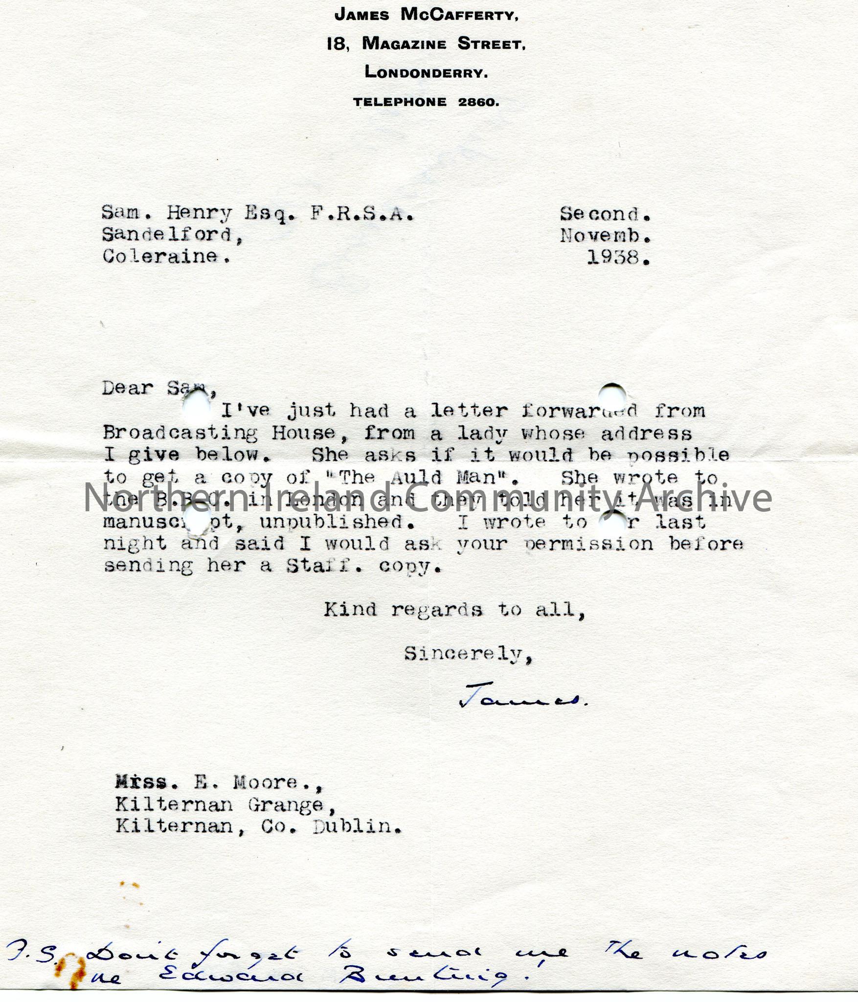 Typed letter to Sam Henry from James McCafferty. Addressed from 18 Magazine Street, Londonderry. Dated 2nd November, 1938. Writes re Sam's song, "The Auld Man". Asking permission to send a copy to Miss E. Moore, Kilternan Grange, Kilternan, Co. Dublin. Asks Sam not to forget to forward information re Edward Bunting.