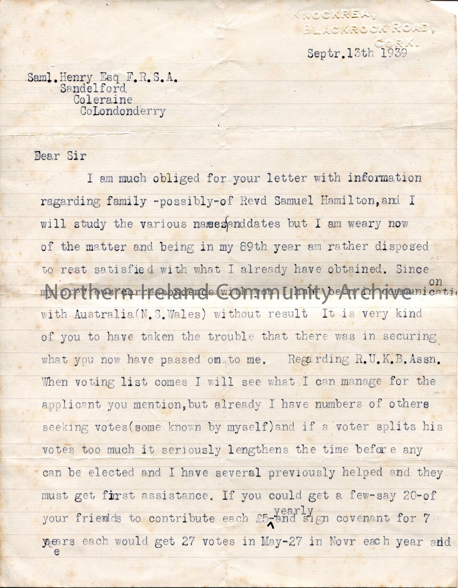 Typed letter to Sam Henry from Leonard Dobbin. Thanks Sam for the family history information and feels that, due to his old age, he satisfied with what has been found. Refers to votes and R.U.K.B Association.