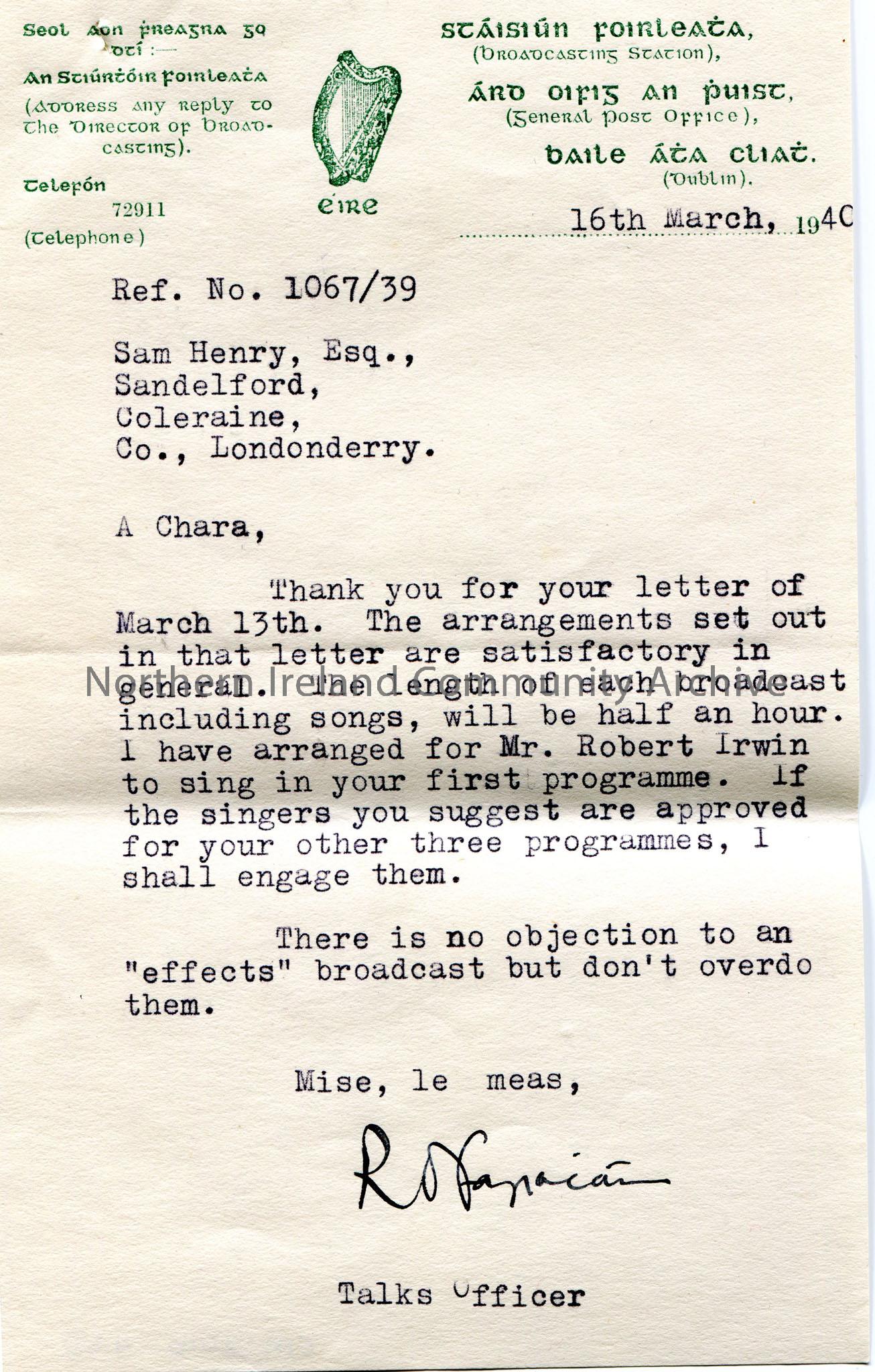 Typed letter to Sam Henry from R O Farachain. Addressed from Broadcasting Station, General Post Office, Dublin. Dated 16th March, 1940. Thanks Sam for letter of 13th March 1940. Agreed with the arrangements set out in letter. Each broadcast to be 30 minutes long. Mr Robert Irwin has been arranged to sing in the first programme. Singer to be approved for other 3 programmes. Agreed to "effects" broadcast.