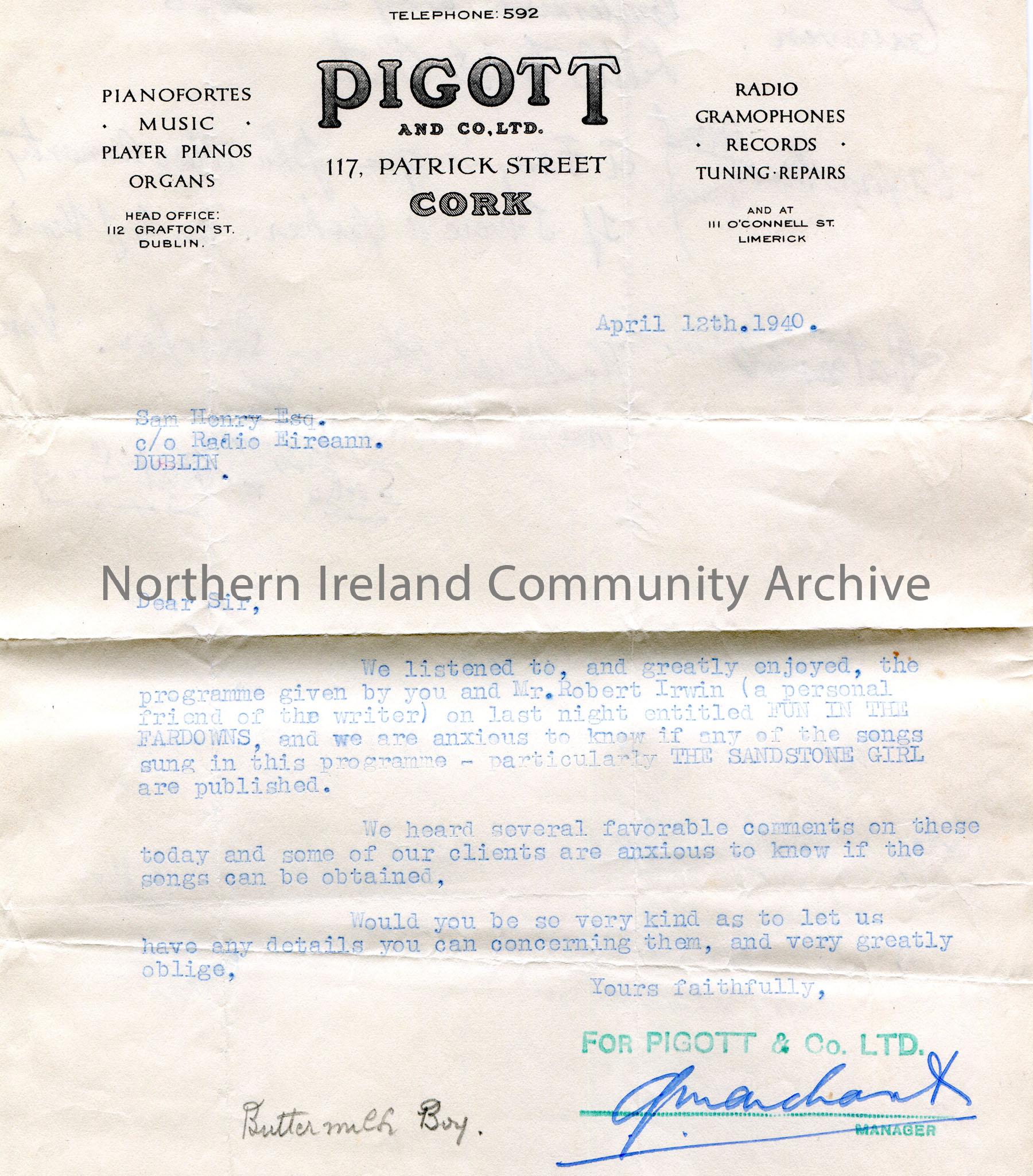 Typed letter to Sam Henry from the manager at Pigott and Co. Ltd, 117 Patrick Street, Cork. Dated 12 April, 1940. Praising programme by Sam and Mr Robert Irwin titled "Fun in the Fairdowns". Keen to know if any of the songs are published. 'Buttermilk Boy' written in pencil at bottom of letter. Rough notes re songs on back of page in pencil.