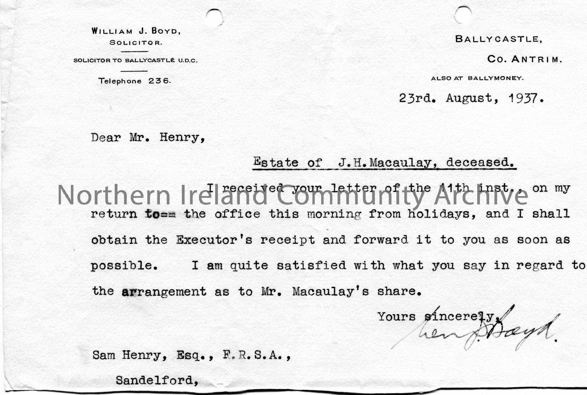 Typed letter to Sam Henry from William J. Boyd, Ballycastle, Co. Antrim. Dated 23rd August, 1937. Writing re estate of J.H.Macaulay, deceased. Received Sam's letter of the 11th inst. To forward the Executor's receipt to Sam. Satisfied with the arrangement re Mr Macaulay's share.